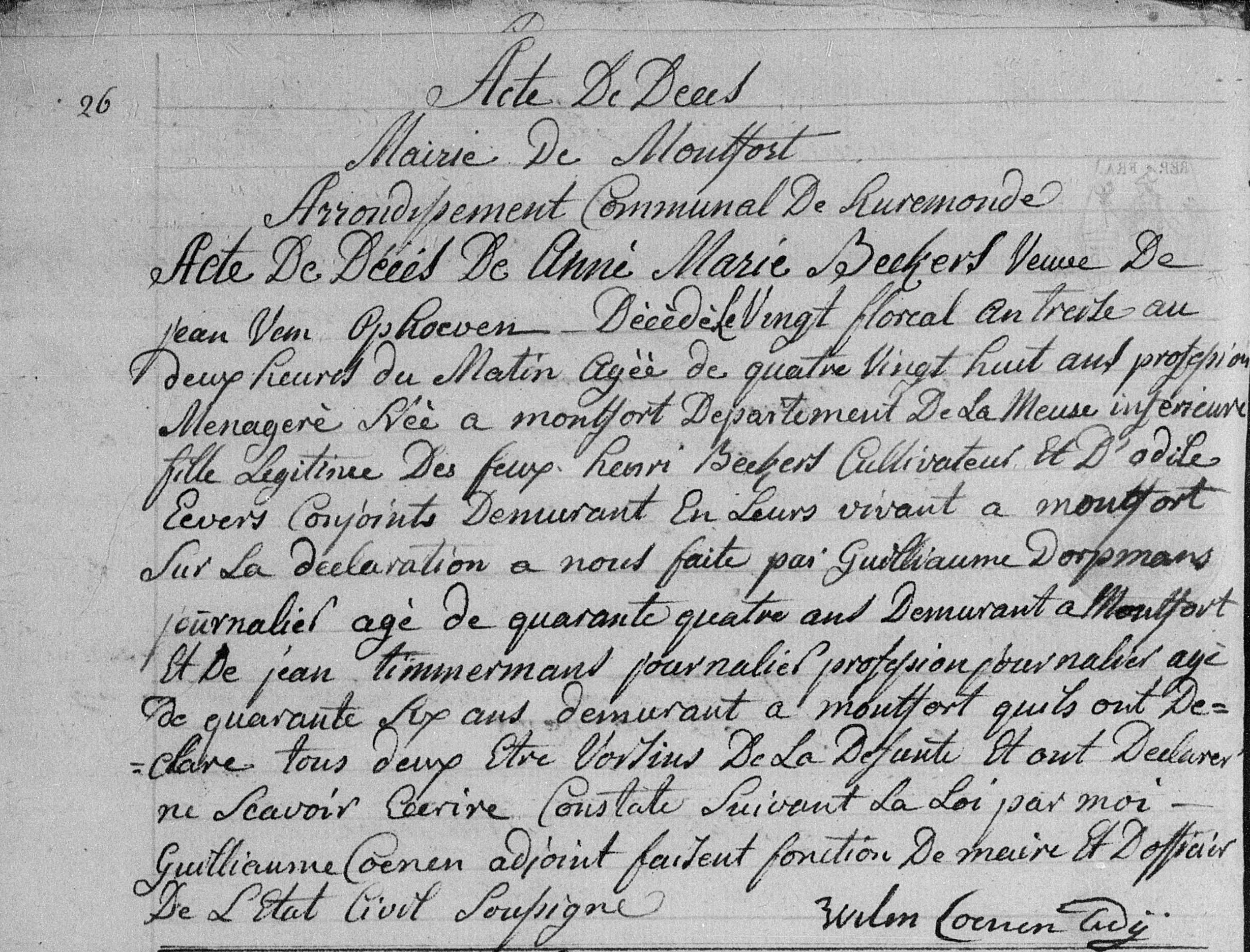- Notitie in het overlijdensregister: weduwe van Henri Beckers, begraven op 24 augustus 1766 op het kerkhof van Montfort