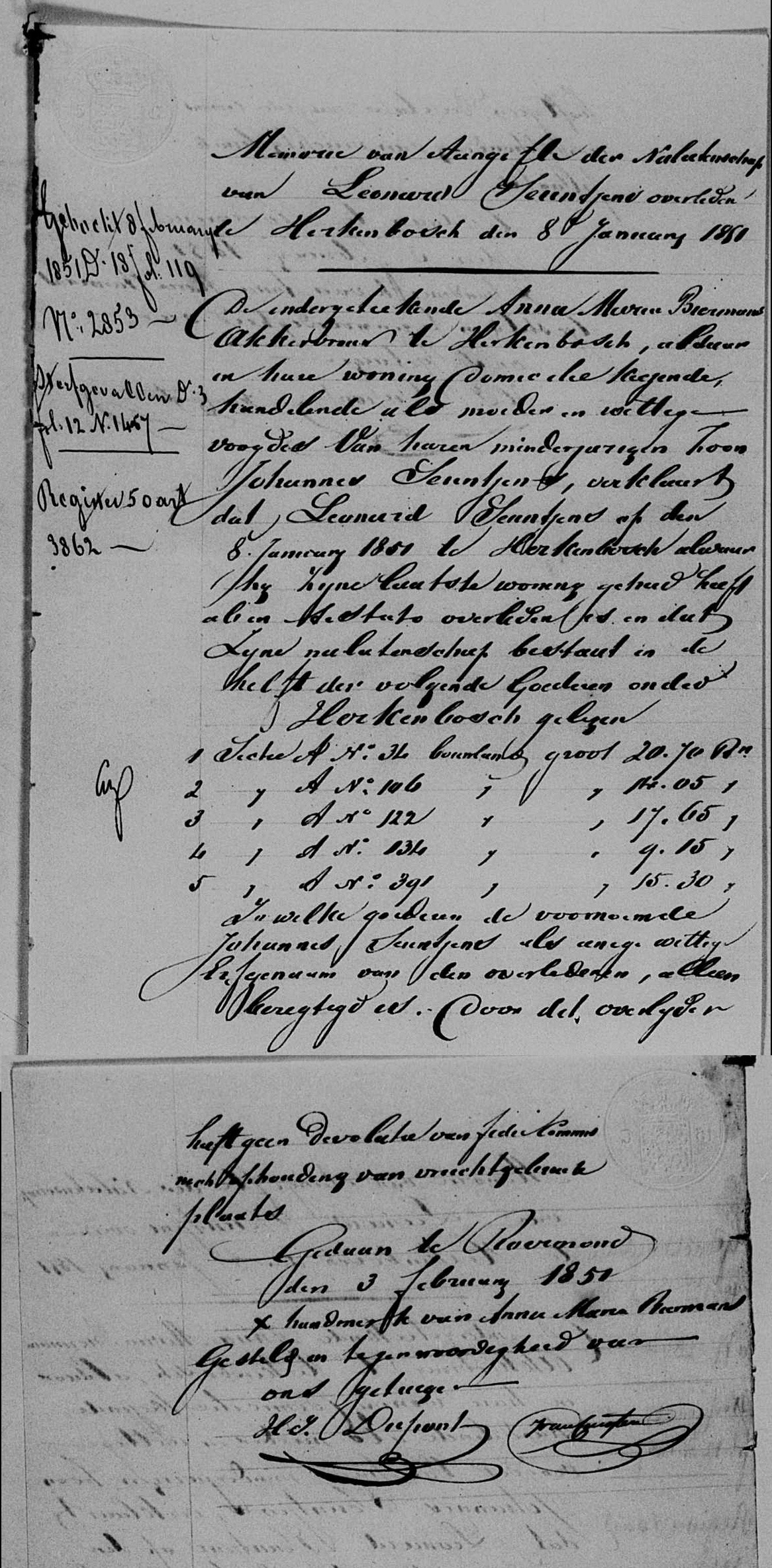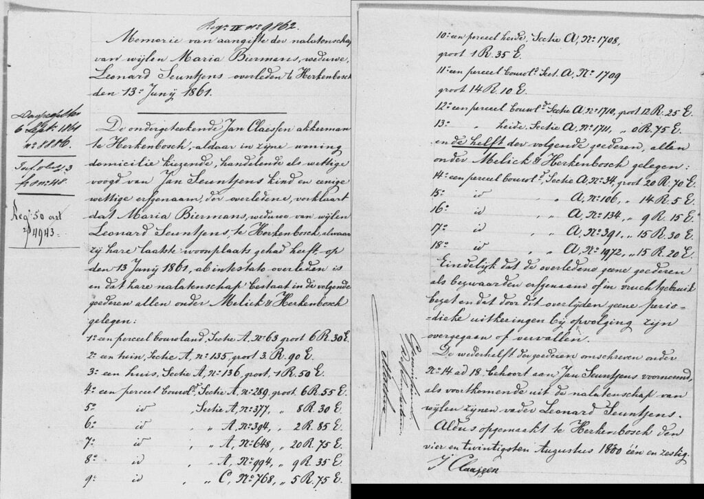 - Zoon Jan als grootgrondbezitter: De inmiddels 19-jarige zoon Jan (onder voogdij van Jan Claessen) erfde alle bezittingen van zijn moeder én de resterende helft van zijn vaders goederen. Hiermee werd hij op slag eigenaar van 18 percelen land (ruim 1,7 hectare). Dit verklaart waarom hij zich in latere aktes vol trots en rechtmatig landbouwer kon noemen, hoewel ook hij nooit leerde schrijven. Jan zette het geslacht Seuntjens met succes voort, eerst met Mechtildis Tillemans en later met Cornelia Zusterzeel