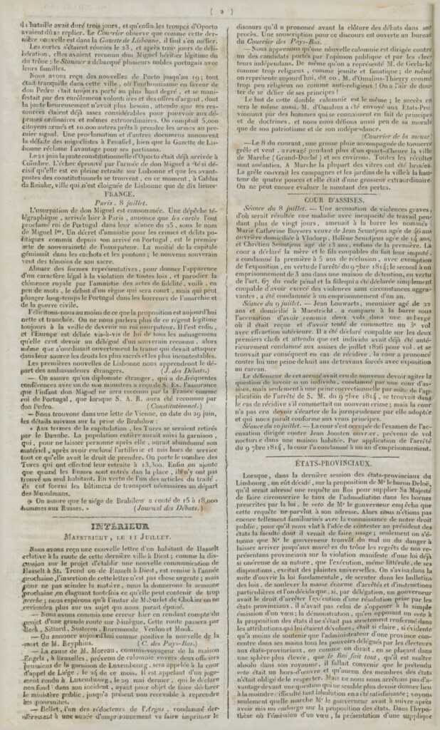 Bron: Journal de la province de Limbourg, editie 12 juli 1828. Oorspronkelijk Franstalig krantenbericht over de rechtszaak tegen de familie Seuntjens. Geraadpleegd via Delpher.