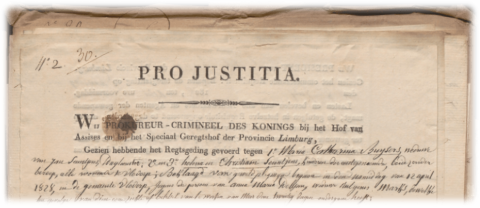 - 16 april 1828: Beëdigd verhoor van het slachtoffer, Anna Maria Delissen, afgenomen op haar ziekbed in Vlodrop
