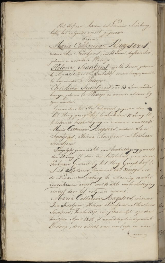 Gehoord den eisch en de Conclusien van den Procureur Crimineel des Konings, en die van de beschuldigden Maria Catharina Buysers, weduwe van Jan Seuntjens, Helena Seuntjens en Christiaan Seuntjens by gestaan door Mr van Cauberg, advokaat hunnen raad tot toepassing der straffe.