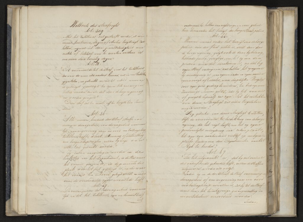 Art: 44. Wanneer iemand onder het toezigt van de hooge politie van den staat gesteld is, wordt daar door de hooge regering, gelyk ook de daar by belang hebbende party, geregtigd, om, tot zy van den persoon wien dit overkomen is, na dat hy zyne straf ondergaan zal hebben, het zy ingeval hy minderjarig is, van zynen vader en zyne moeder zynen voogd of Curator, eenen deugdelyken Borgtogt voor zyn goed gedrag te vorderen, ten bedrage van zoodanige sommen gelds, als by het vonnis of geregts bepaald zal zyn. Tot het verstrekken van dezen Borgtogt zal ieder toegelaten mogen worden. By gebreke van dezen Borgtogt te stellen, blyft de veroordeelde ter beschikking van de hooge regering, die het regt heeft, om het zy zyne persoonlyke verwydering van zekere plaats, het zy zyn aanhoudend verblyf op eene bepaalde plaats binnen een der Departementen van het Ryk te bevelen.