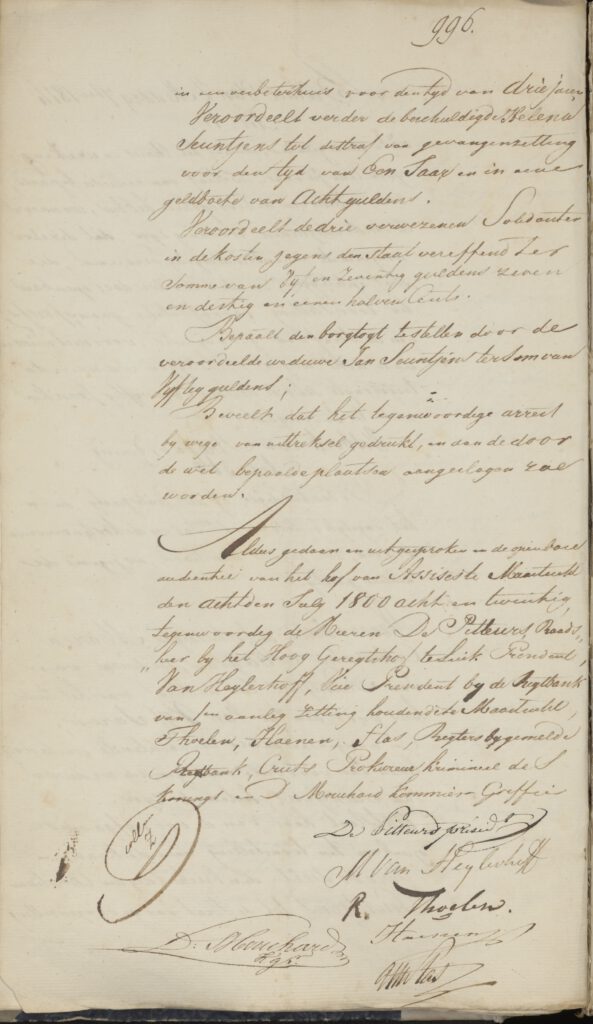 Aldus gedaan en uitgesproken in de openbare audientie van het hof van Assises te Maastricht den achtsten Julij 1800 acht en twintig, Tegenwoordig de Heeren De Limpens Raadsheer by het Hoog Geregtshof te Luik President Van Regtswege, Vice President by de Regtbank van 1en aanleg zitting houdende te Maastricht, F.W.B. Baron van de Olne, W.E. de Selys Fanson Regters by gemelde Regtbank, J.N.J. Heusschen Procureur Crimineel des Konings en K.A.S. Berhaut Commies-Griffier.