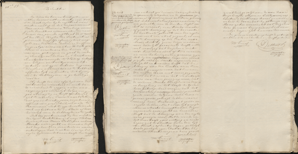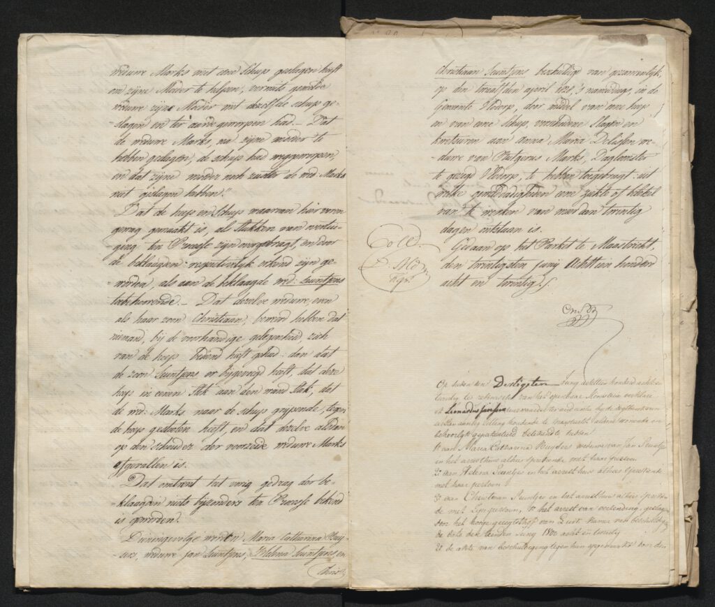 Zoo hebben wy ons heden vergezeld van den Heere Commies Griffier by de regtbank van eersten aanleg te gezegde Roermond in de gemeente Vlodrop ter woning van gezegde Anna Maria Delissen, weduwe Marks begeven om haar getuigenis af te nemen.