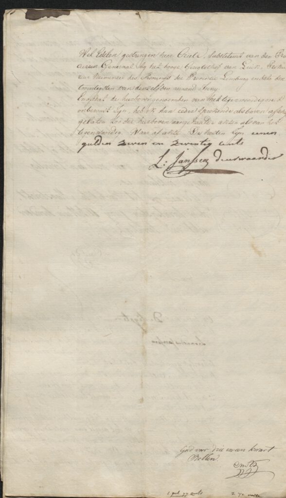Aan den Wel Edelen gestrengen Heer de Heer Procureur des Konings Van de Regtbank der eerste aanleg zitting houdende te Roermonde.