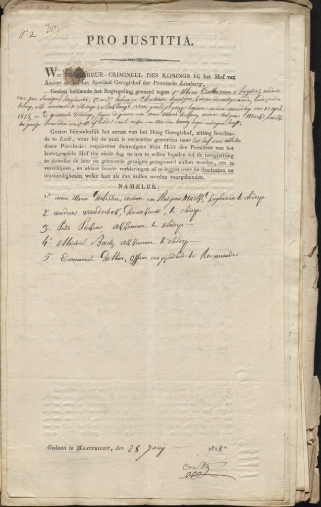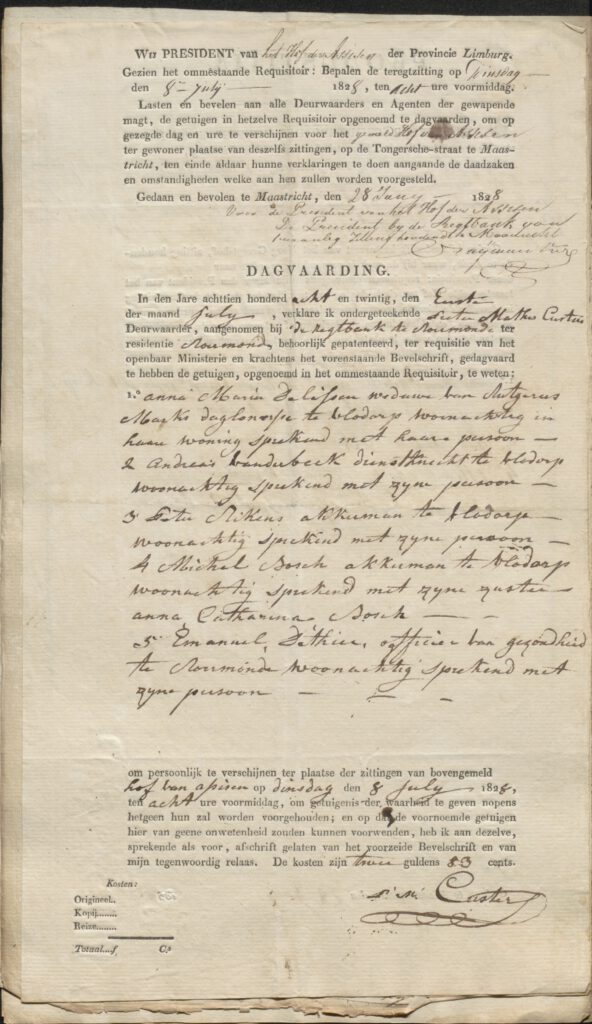 WIJ PRESIDENT van het Hof van Assisen der Provincie Limburg, Gezien het ommestaande Requisitoir: Bepalen de teregtsitting op Dingsdag den 8e July 1828, ten Acht ure voormiddag. Lasten en bevelen aan alle Deurwaarders en Agenten der gewapende magt, de getuigen in hetzelve Requisitoir opgenoemd te dagvaarden, om op gezegde dag en ure te verschijnen voor het gemeld hof van assisen ter gewoner plaatse van deszelfs zittingen, op de Tongersche-straat te Maastricht, ten einde aldaar hunne verklaringen te doen aangaande de daadzaken en omstandigheden welke aan hen zullen worden voorgesteld. Gedaan en bevolen te Maastricht, den 28 Juny 1828 Voor de President van het Hof van Assisen De President by de Regtbank van 1en aanleg Zitting houdende te Maastricht (Handtekening)