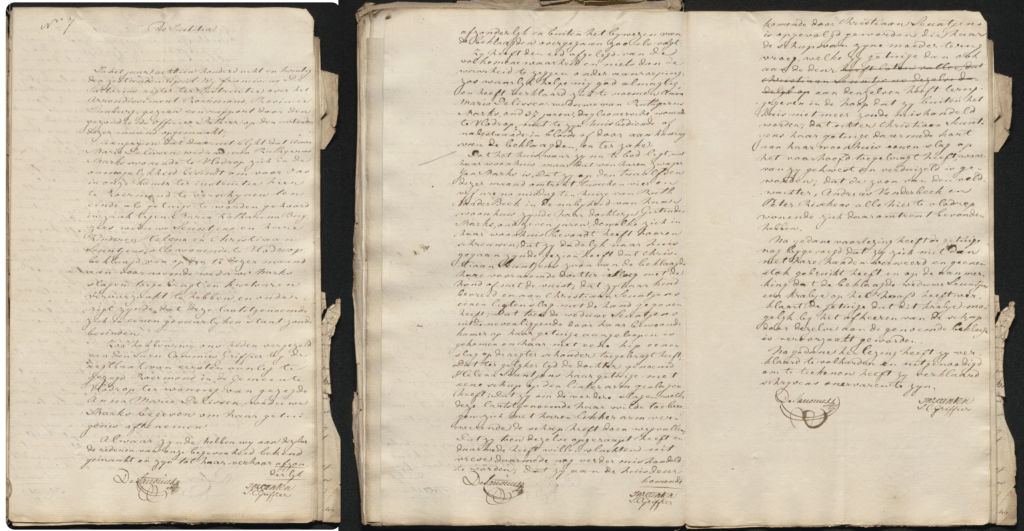 Dezelve Peter Piskens verklaart aan de te hebben dezelve zijnde uit het huis gekomen en gekeert de voornoemde Delissen roepende dat zij haer geslagen hadden, en dezelve gansch bebloed, behalve verklaart nog Michiel Bosch jong man oud zevenenveertig jaren zonder beroep nabeur van dezelve gezien te hebben. Terwijl de vrouw geslagen is dat zij niet gaan kan of gevaarlijk, zoo vonden het zeer noodig zijn zoo spoedig als mogelijk dezelve door Doctoor of Schirurijn te laten viseteren.