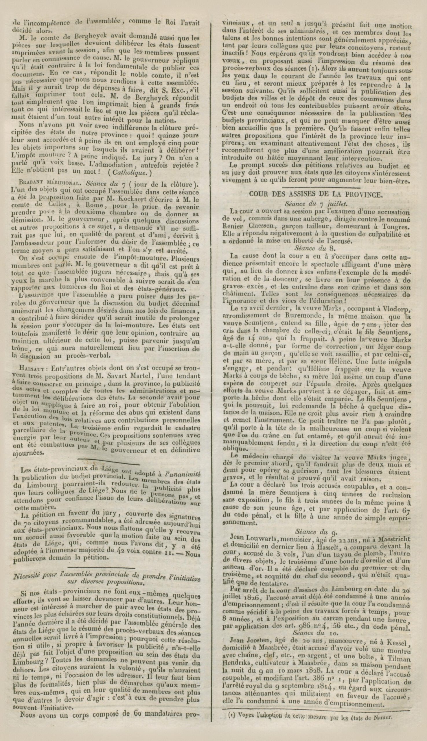 Bron: Journal de la province de Limbourg, editie 12 juli 1828. Oorspronkelijk Franstalig krantenbericht over de rechtszaak tegen de familie Seuntjens. Geraadpleegd via Delpher.