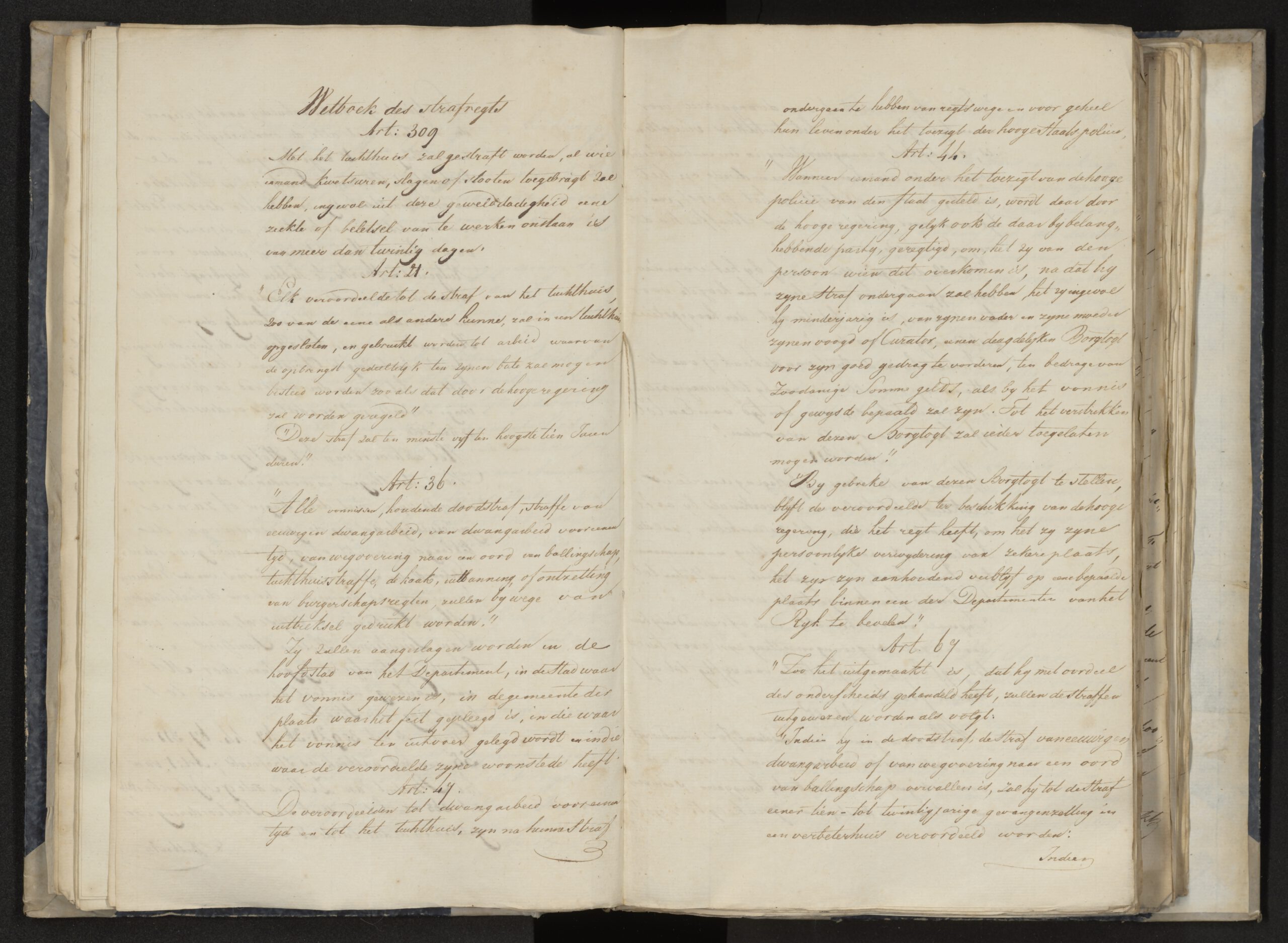 Art: 36. Alle vonnissen houdende doodstraf, straffe van eeuwigen dwangarbeid, van dwangarbeid voor eenen tyd, van wegruiming naar een oord van ballingschap, tuchthuisstraffe, de kaak, verbanning, of ontzetting van burgerschapsregten, zullen by wege van uittreksel gedrukt worden. Zy zullen aangeslagen worden in de hoofdstad van het Departement, in de stad waar het vonnis gewezen is, in de gemeente der plaats waar het feit gepleegd is, in die waar het vonnis ter uitvoer gelegd wordt en in die waar de veroordeelde zyne woonstede heeft.