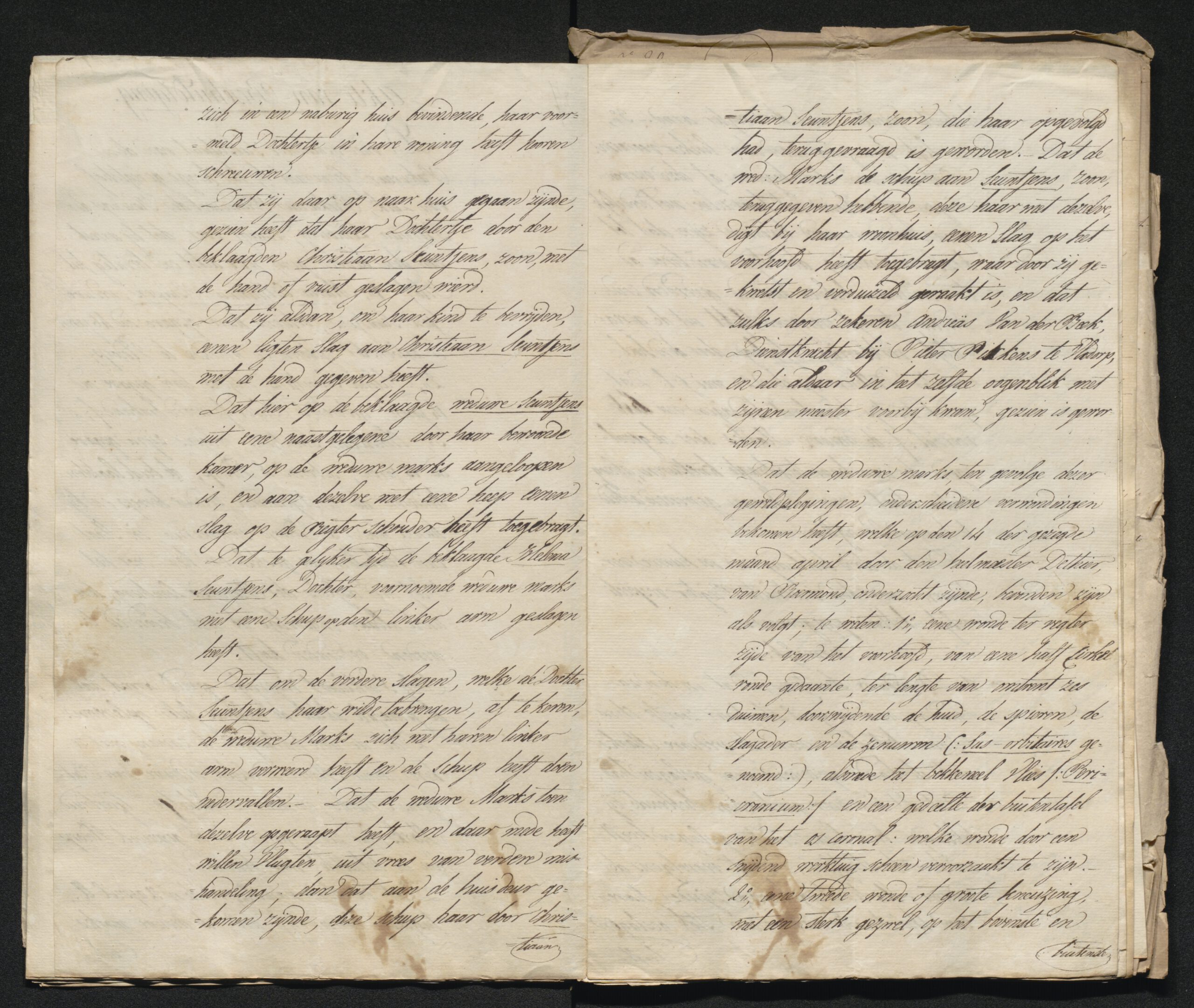 - Helena Seuntjens, Dochter. Dat zij geene mishandelingen jegens de weduwe Marks gepleegd heeft. Dat hare Moeder ook gemelde Weduwe Marks met geene heep geslagen heeft, maar alleen de schup uit handen dezer laatste genomen en daarmede zich verweerd heeft. Dat het waar is dat haar broeder Christiaan de weduwe Marks met eene schup geslagen heeft, welke schup deze laatste hem had overgegeven, na dezelve te hebben opgeraapt terwijl hare moeder ter aarde lag.