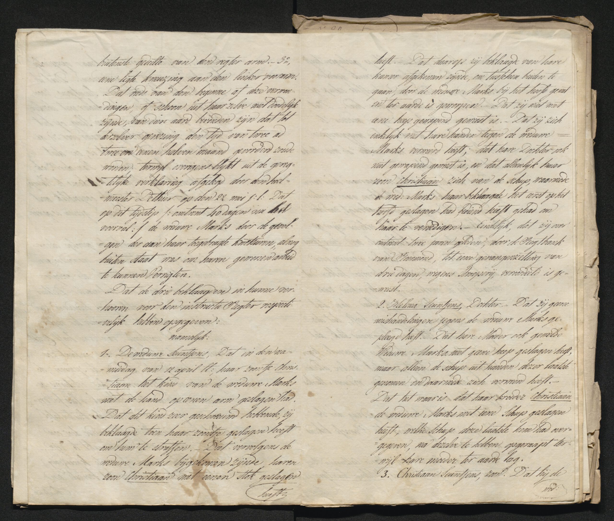 - Christiaan Seuntjens, zoon. Dat hij de weduwe Marks met eene schup geslagen heeft om zijne Moeder te helpen, vermits gemelde weduwe zijne Moeder met dezelfde schup geslagen en ter aarde geworpen had. Dat de weduwe Marks, na zijne moeder te hebben geslagen, de schup had weggeworpen en dat zijne moeder noch zuster de wed: Marks niet geslagen hebben.
