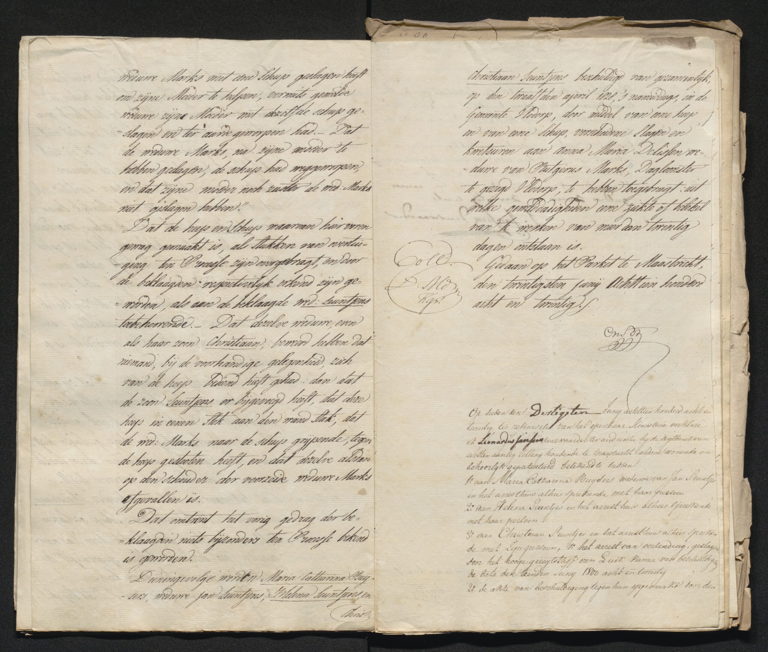 Zoo hebben wy ons heden vergezeld van den Heere Commies Griffier by de regtbank van eersten aanleg te gezegde Roermond in de gemeente Vlodrop ter woning van gezegde Anna Maria Delissen, weduwe Marks begeven om haar getuigenis af te nemen.