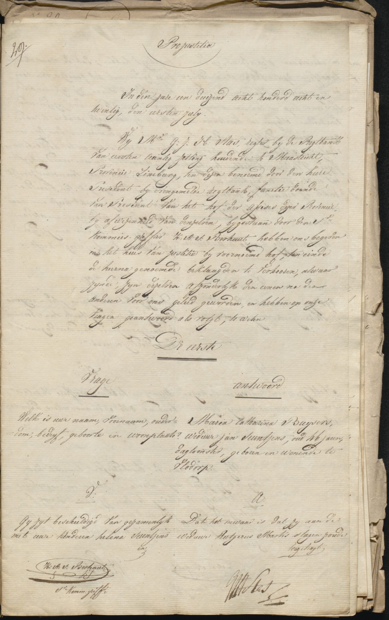 Vrage: Welk is uw naam, Voornaam, ouderdom, beroep, geboorte en woonplaats? Antwoord: Maria Catharina Buysers, weduwe Jan Seuntjens, oud 46 jaren, dagloonster, geboren en wonende te Vlodrop.