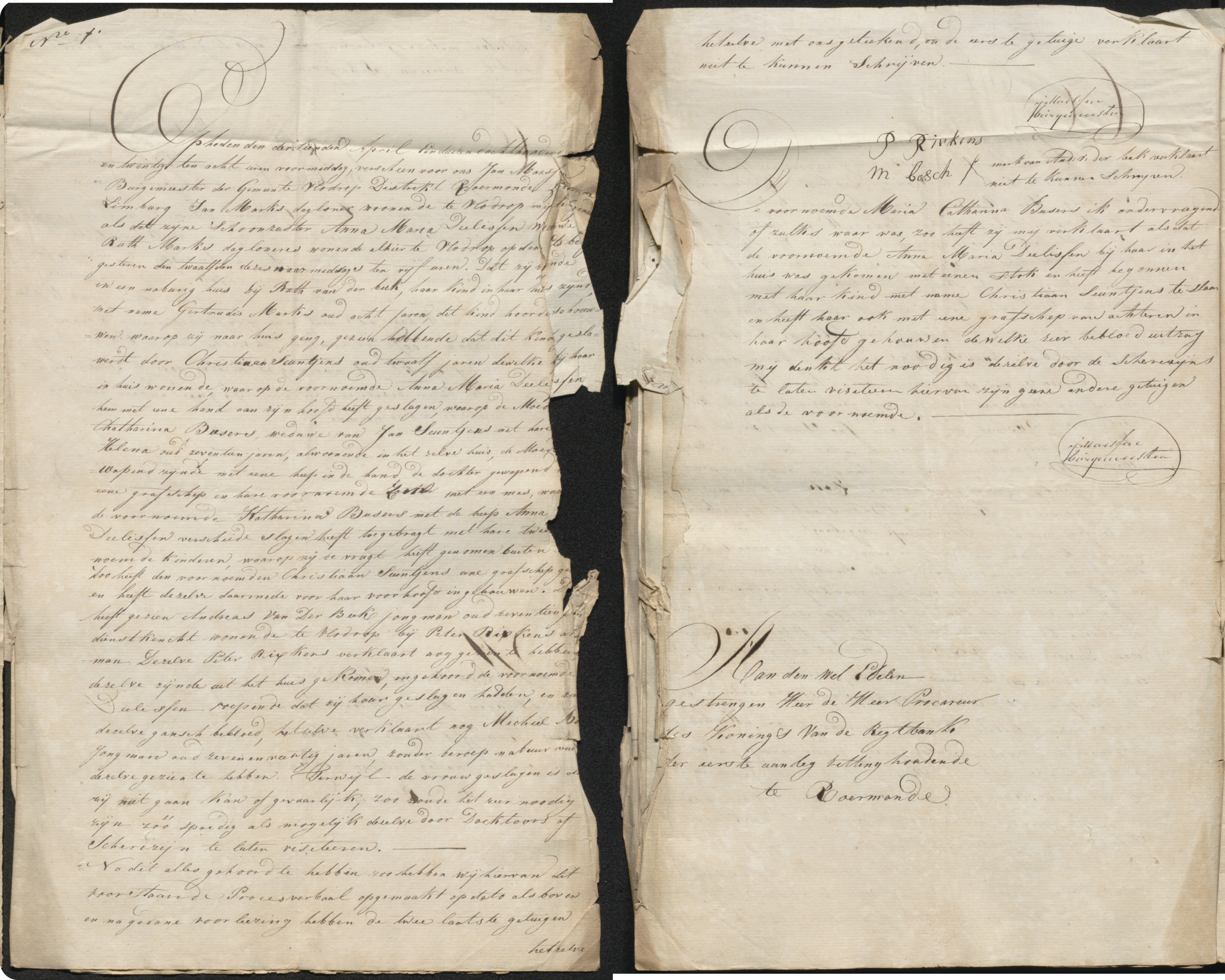 Op Verzoek Van den Heer Procureur des Konings, heb ik ondergeteekende Heelmeester my begeven naar de Gemeente Vlodorp, op heden den 14 April 1828. om aldaar in de tegenwoordigheid van den Heer Burgemeester der Gemelde Gemeente de Wonden Welke Anna Maria Delissen, weduwe van Ruth Marks, op den 12 dezer maand ontvangen had te onderzoeken, Ik Vond haar in den Volgenden toestand.