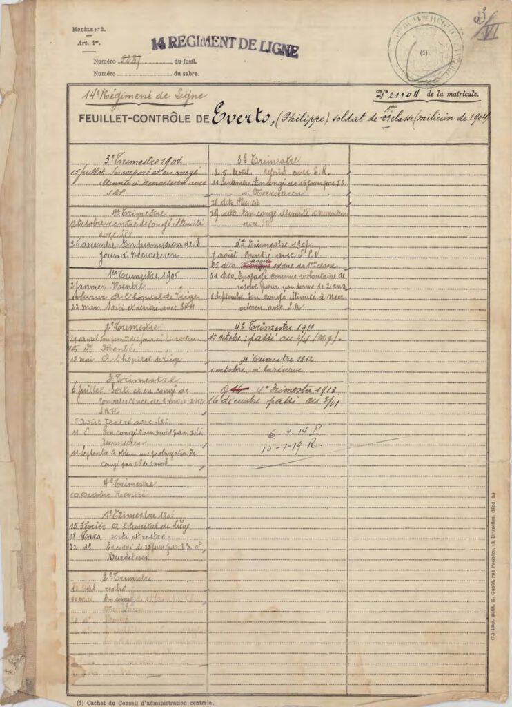- Het “Feuillet-Contrôle” is een document dat per kwartaal zijn vooroorlogse militaire verplichtingen bijhoudt tussen 1904 en 1913.