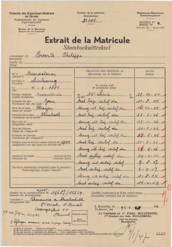 De Dienstplicht vóór de Oorlog In het begin van de 20ste eeuw kende België het systeem van loteling en dienstplicht. Philippus behoorde tot de militieklasse van 1904 en werd op 15 juli 1904 ingelijfd. Hij werd ingedeeld bij het 14de Linieregiment met stamnummer 21104.