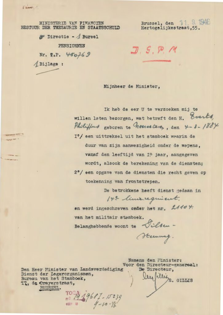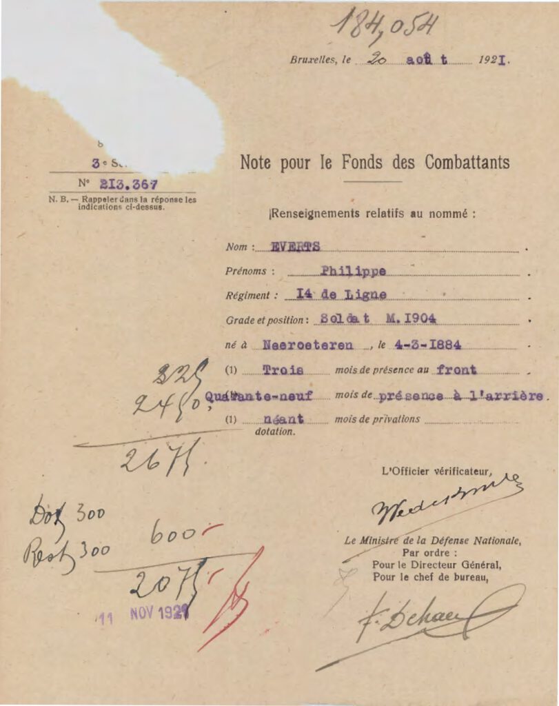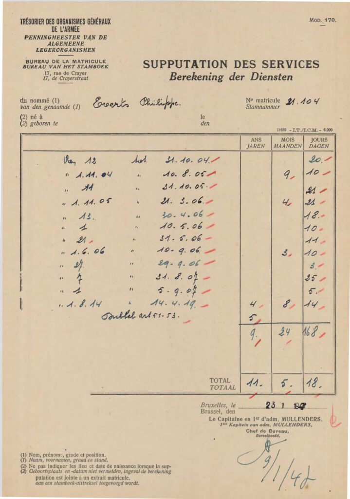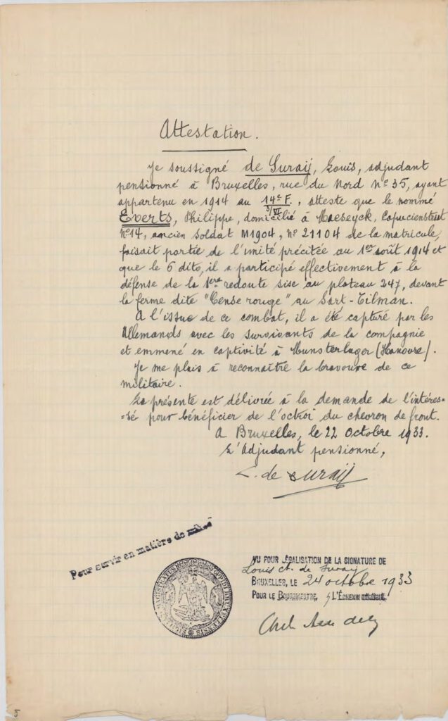 - Je soussigné de Suray, Louis, adjudant pensionné à Bruxelles, rue du Nord n° 35, ayant appartenu en 1914 au 14e de Ligne, atteste que le nommé Everts, Philippe, domicilié à Maeseyck, Capucienenstraat n° 14, ancien soldat Mil[icien] 1904, n° 21104 de la matricule, faisait partie de l’unité précitée au 1er août 1914 et que le 6 dito, il a participé effectivement à la défense de la 3me redoute sise au plateau 247, devant la ferme dite “Cense rouge” au Sart-Tilman.
