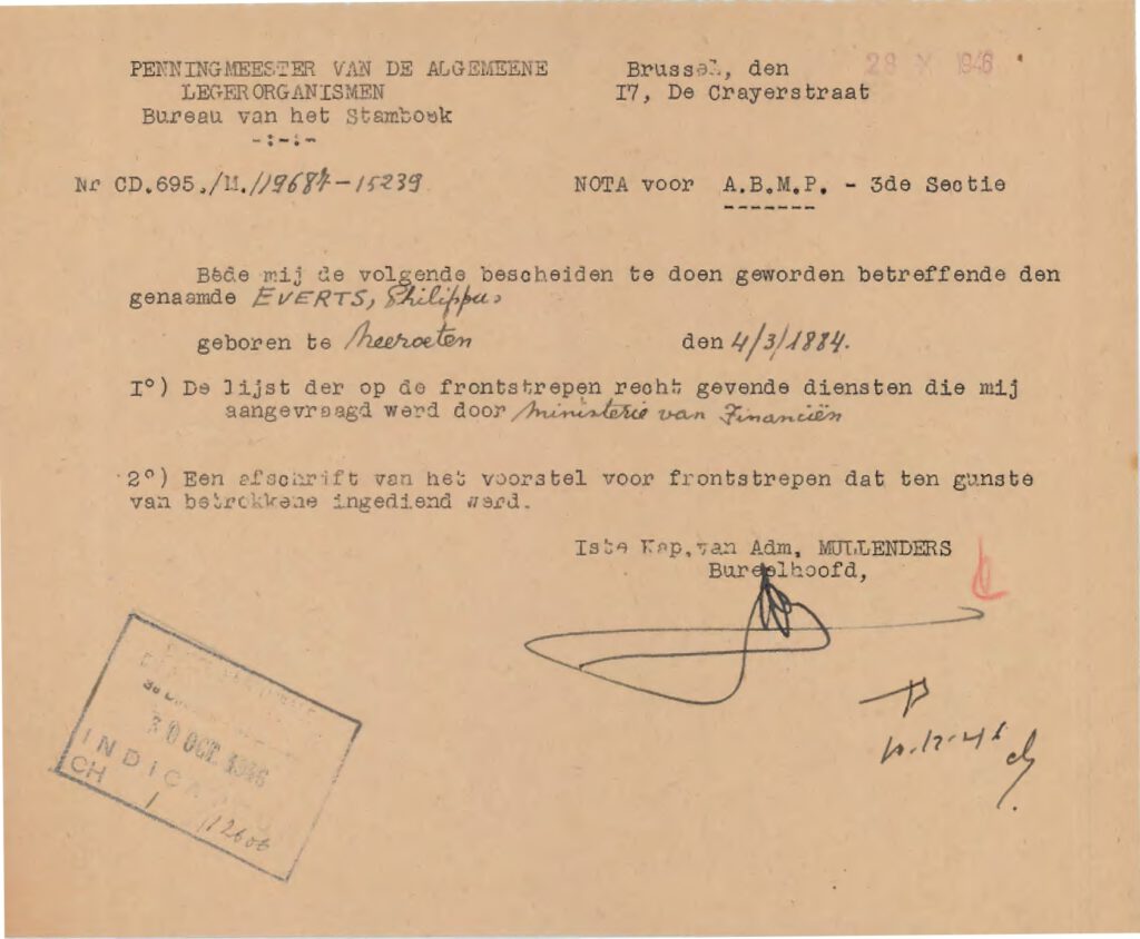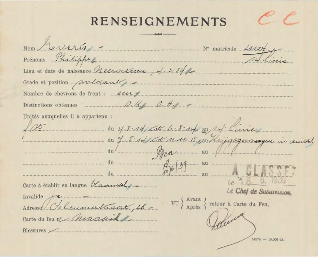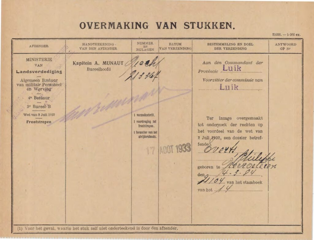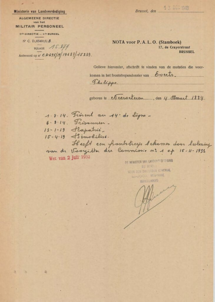 - 15 nov 1933: De militaire commissie te Luik kent hem officieel één frontstreep toe.