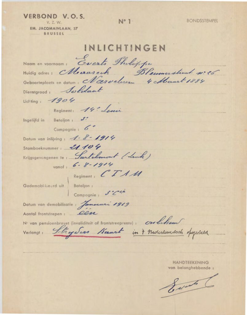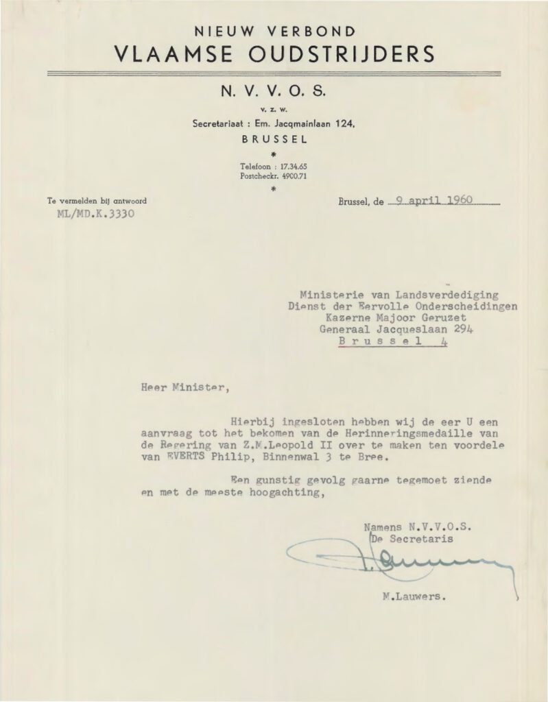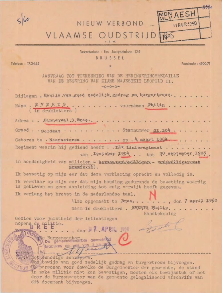 - Dit is een aanvraagformulier dat op 7 april 1960 werd ingediend door het Nieuw Verbond der Vlaamse Oudstrijders (N.V.V.O.S.).