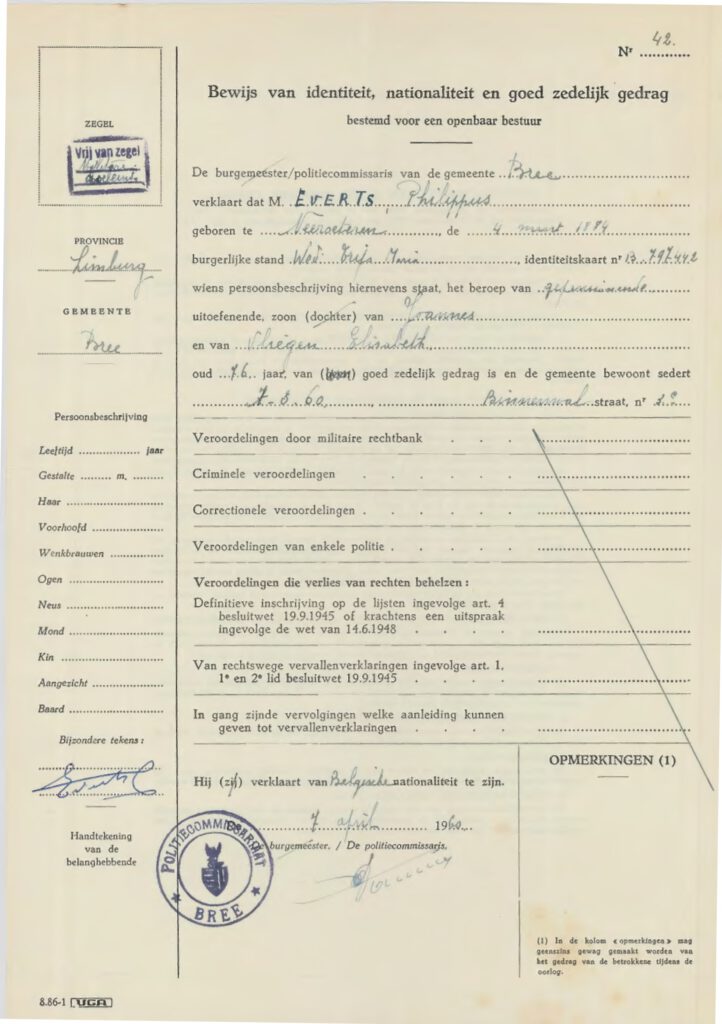 - Het dossier bevat een bijgevoegd bewijs van goed zedelijk gedrag, afgeleverd door de politie van Bree, waaruit blijkt dat hij op dat moment op het adres Binnenwal 3 te Bree woonde.