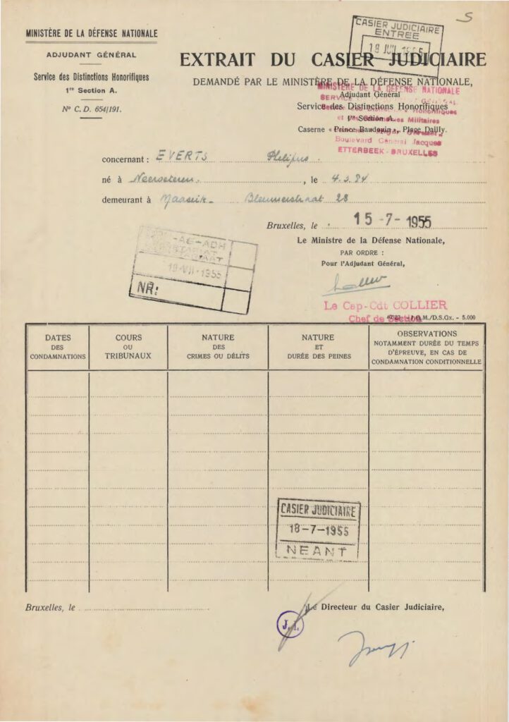 - Een officieel uittreksel (“Extrait du Casier Judiciaire”) dat op 15 juli 1955 werd aangevraagd door Landsverdediging.
