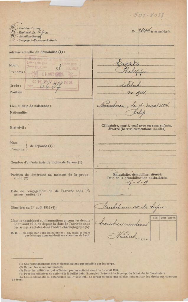 - Dit is de omslag en het formulier “Proposition Chevrons de Front” met de stamgegevens van Philippus Everts: soldaat van de lichting 1904, 14de Linieregiment, stamnummer 21104.