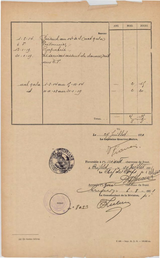 - Het geeft een overzicht van zijn diensttijd: hij werd ingelijfd op 15 juli 1904, werd krijgsgevangene in Duitsland vanaf 6 augustus 1914, en werd gerepatrieerd op 15 januari 1919.