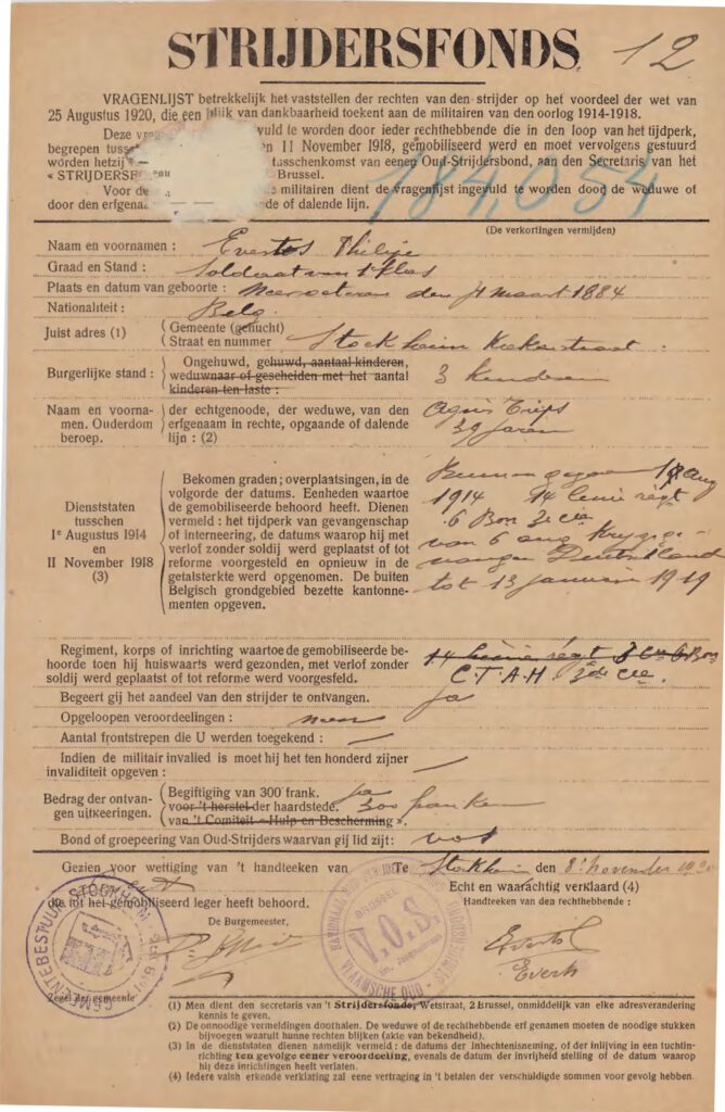 - Voordeel: Als drager van de kaart ontving hij onder meer een “begiftiging voor herstel der haardstede” ten bedrage van 300 frank uit het Strijdersfonds.