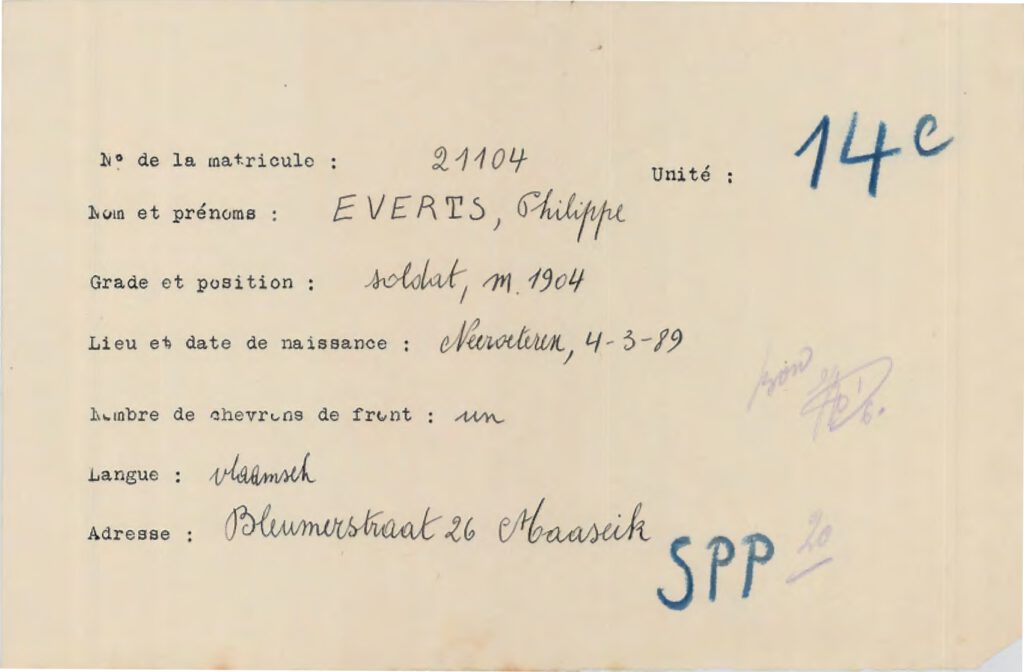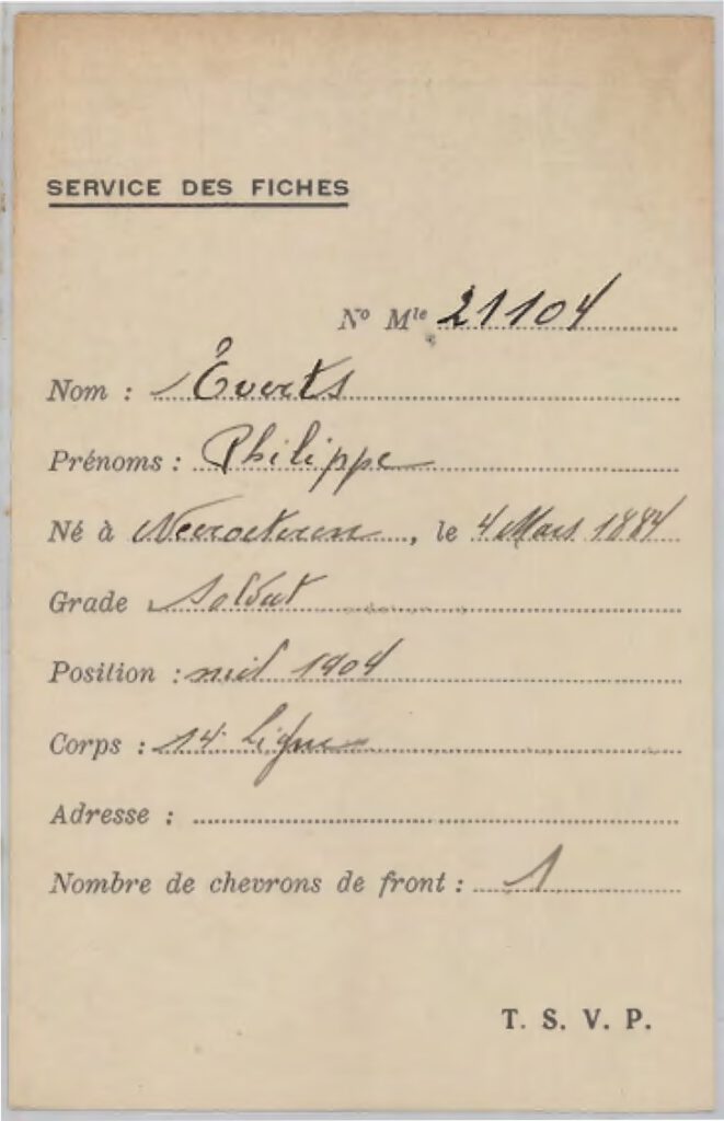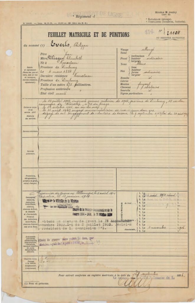 - Dit is het “Feuillet Matricule et de Punitions” (Stamboekblad) waarop zijn fysieke signalement (waaronder een gestalte van 1,615 m) en de namen van zijn ouders, Joannes Everts en Elisabeth Vliegen, staan vermeld.