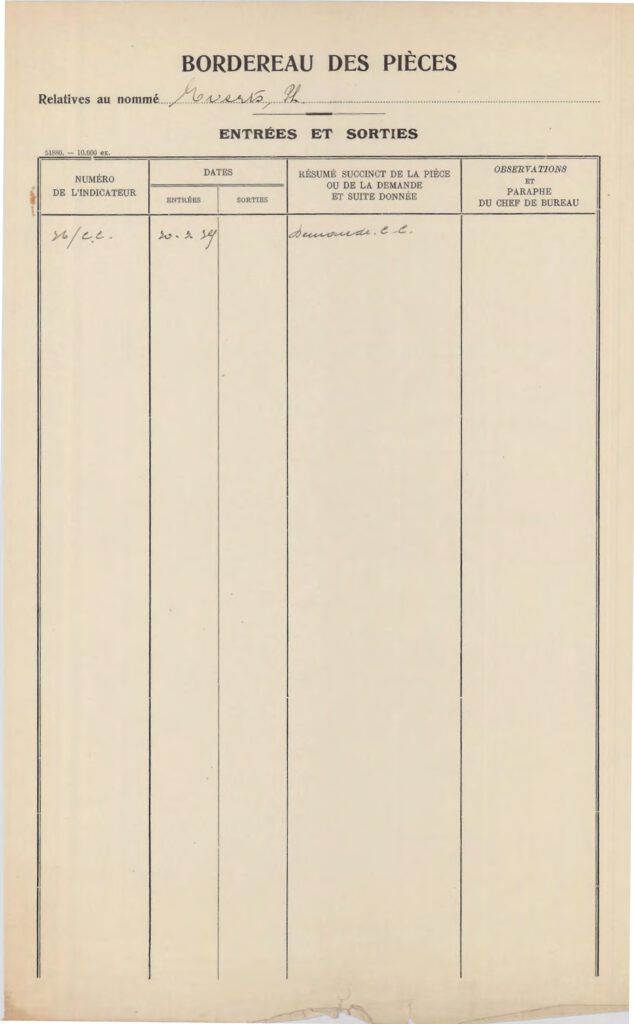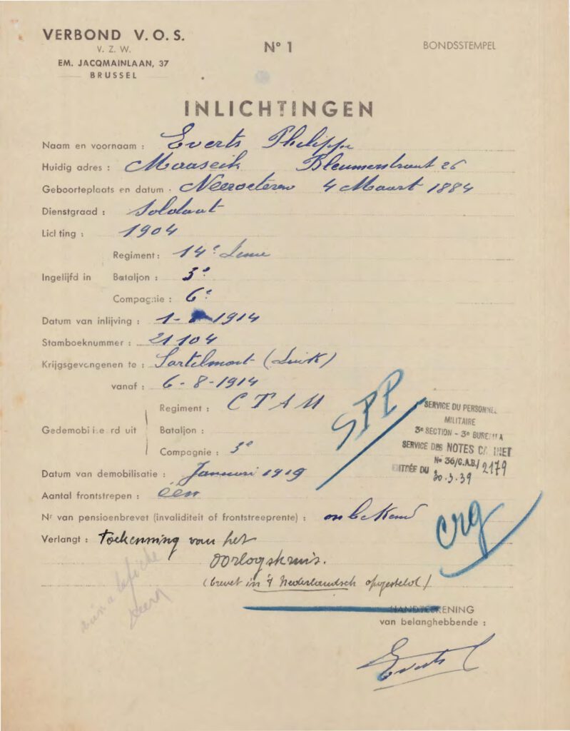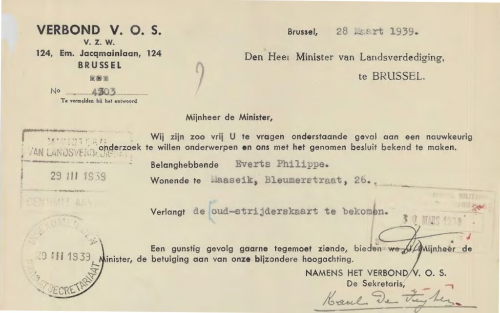 - Een reeks brieven en inlichtingenfiches van het V.O.S. uit maart 1939 om voor hem de Strijderskaart (Carte du Feu) en het Oorlogskruis in orde te maken.
