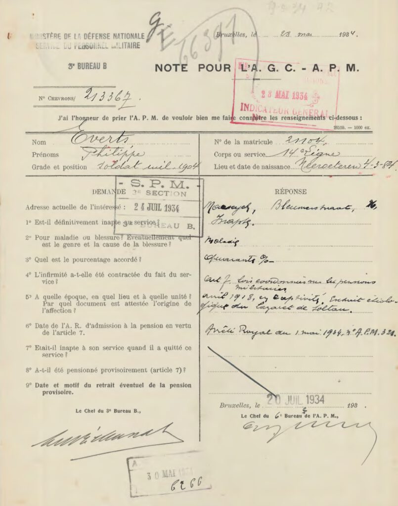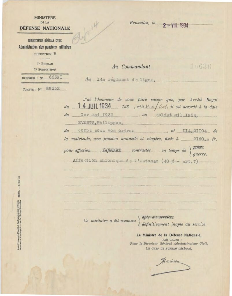 - Pensioen: Hij werd definitief medisch ongeschikt verklaard voor militaire dienst. Bij Koninklijk Besluit van 14 juli 1934 werd hem, met terugwerkende kracht vanaf 1 mei 1933, een jaarlijks en levenslang invaliditeitspensioen van 2160 frank toegekend.