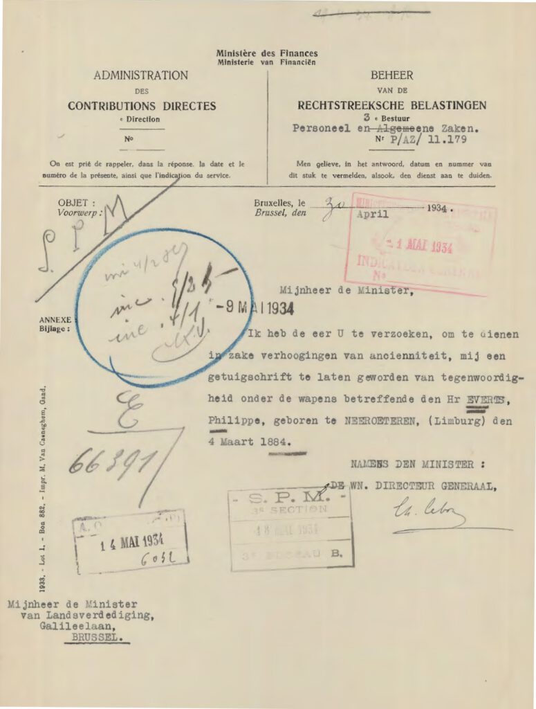 - Het Ministerie van Financiën vroeg zijn exacte bewijs van tegenwoordigheid onder de wapens op om zijn pensioen correct te kunnen berekenen.