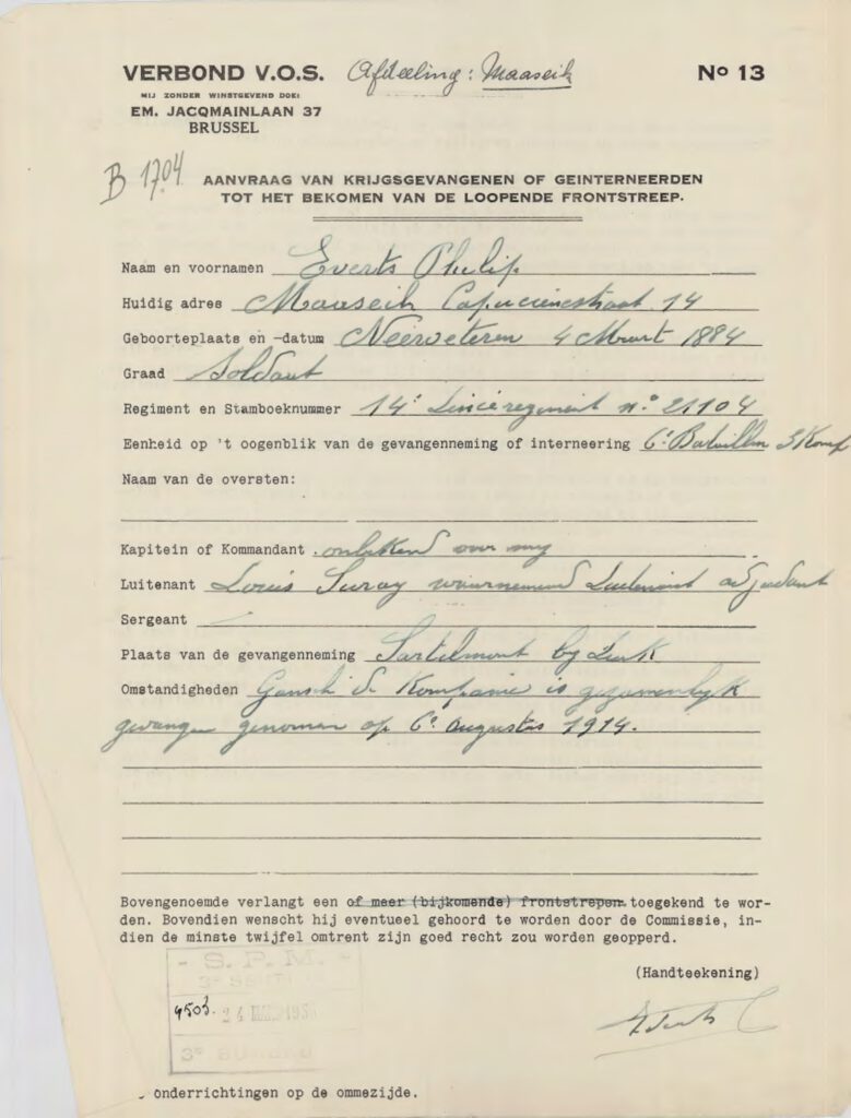 - Ik, ondergetekende, de Suray, Louis, adjudant, gepensioneerd te Brussel, Noordstraat nr. 35,in 1914 behorende tot het 14de Linieregiment, verklaar dat de genaamde, Everts, Philippe, wonende te Maaseik, Capucienenstraat nr. 14, oud-soldaat milicien lichting 1904, stamnummer 21104, deel uitmaakte van de voornoemde eenheid op 1 augustus 1914 en dat hij op de 6de van diezelfde maand [augustus] daadwerkelijk heeft deelgenomen aan de verdediging van de 3de redoute, gelegen op plateau 247, voor de hoeve genaamd “Cense Rouge” te Sart-Tilman.