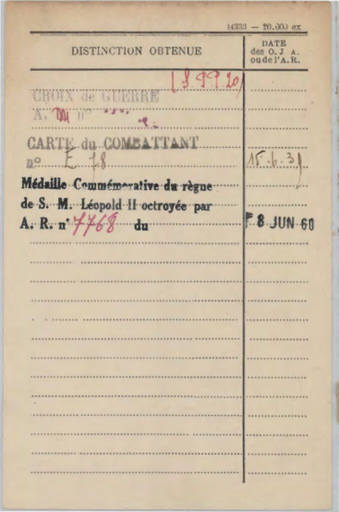- Het bevestigt de toekenning van het Oorlogskruis (Croix de Guerre) op 18 september 1920, de Strijderskaart (Carte du Combattant) op 15 juni 1931, en de Herinneringsmedaille van de regeerperiode van Z.M. Leopold II op 8 juni 1960.