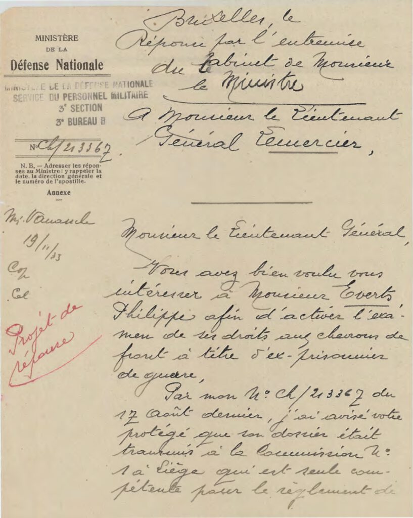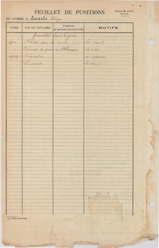 - Detail: Het statuut werd vaak gekoppeld aan de “Frontstrepen” (Chevrons de Front). Hoewel Philippus “slechts” 6 dagen effectief aan het front vocht (1 tot 6 augustus 1914), werd hem, na een hoorzitting in 1933, officieel één frontstreep toegekend vanwege zijn deelname aan de cruciale gevechten in Luik voor zijn gevangenneming.