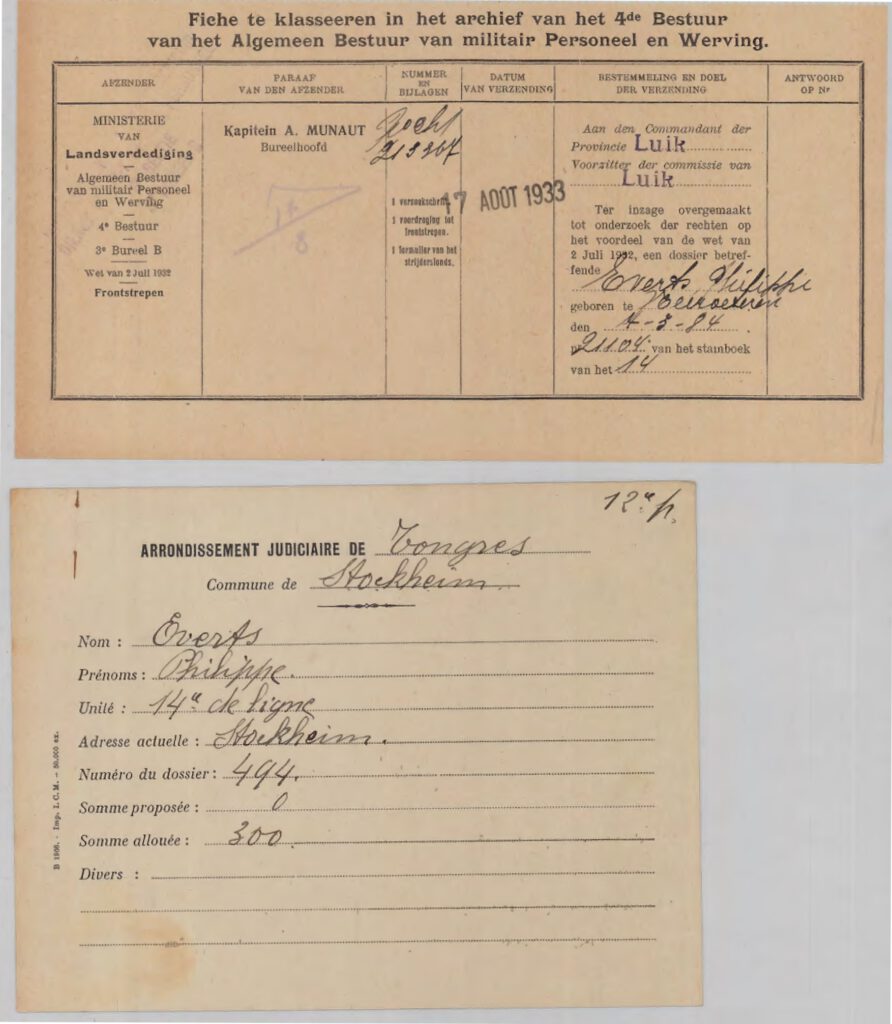 - Dit zijn vroege formulieren (1920-1921) voor de erkenning als oud-strijder en uitkeringen vanuit het Strijdersfonds.