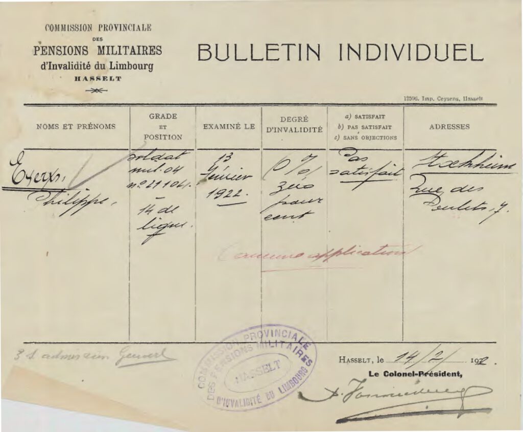 - Invaliditeitsgraad: Bij een medisch onderzoek in Hasselt op 13 oktober 1922 werd zijn invaliditeit nog op 20% geschat. Later werd dit opgetrokken naar 40% (artikel 7 van de pensioenwet).