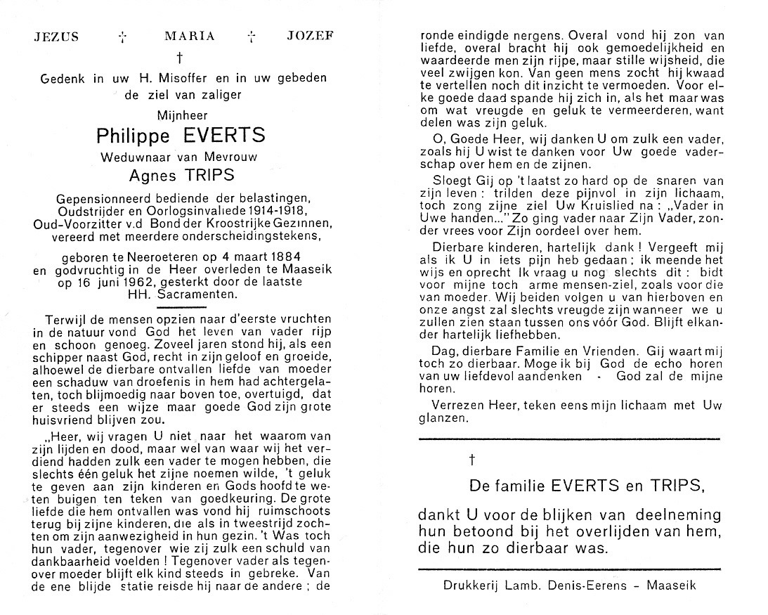Philippus Everts werd geboren op 4 maart 1884 in Neeroeteren als zoon van Joannes Everts en Maria Elisabeth Vliegen.