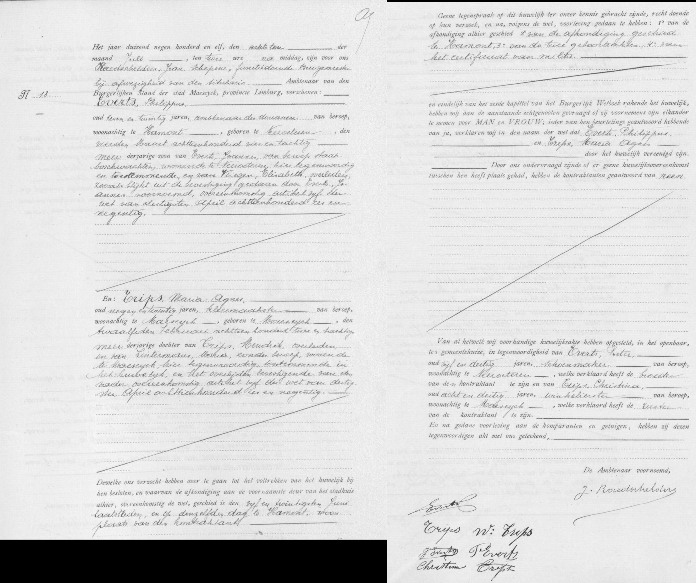 Philippus Everts is douanier. Zijn vader Joannes is staatsboswachter in Neeroeteren en is aanwezig bij het huwelijk. Zijn moeder, Elisabeth Vliegen is bij het huwelijk al overleden.