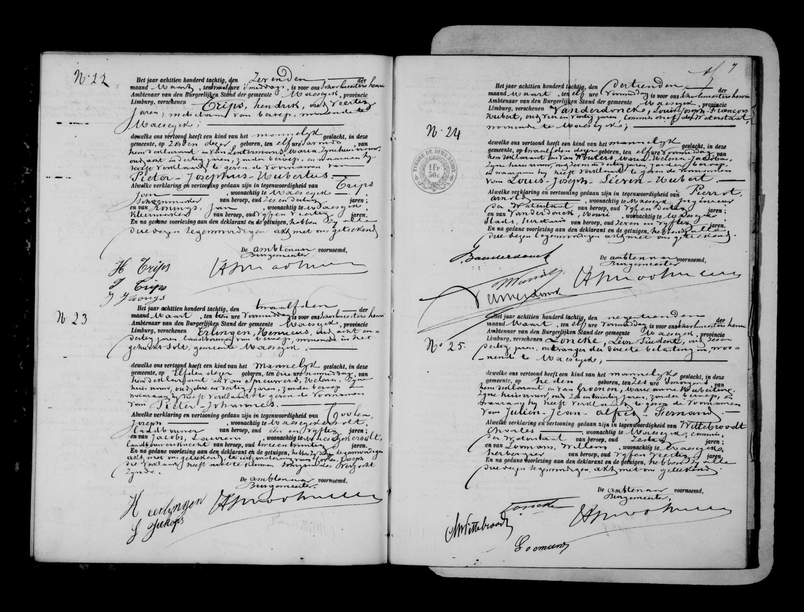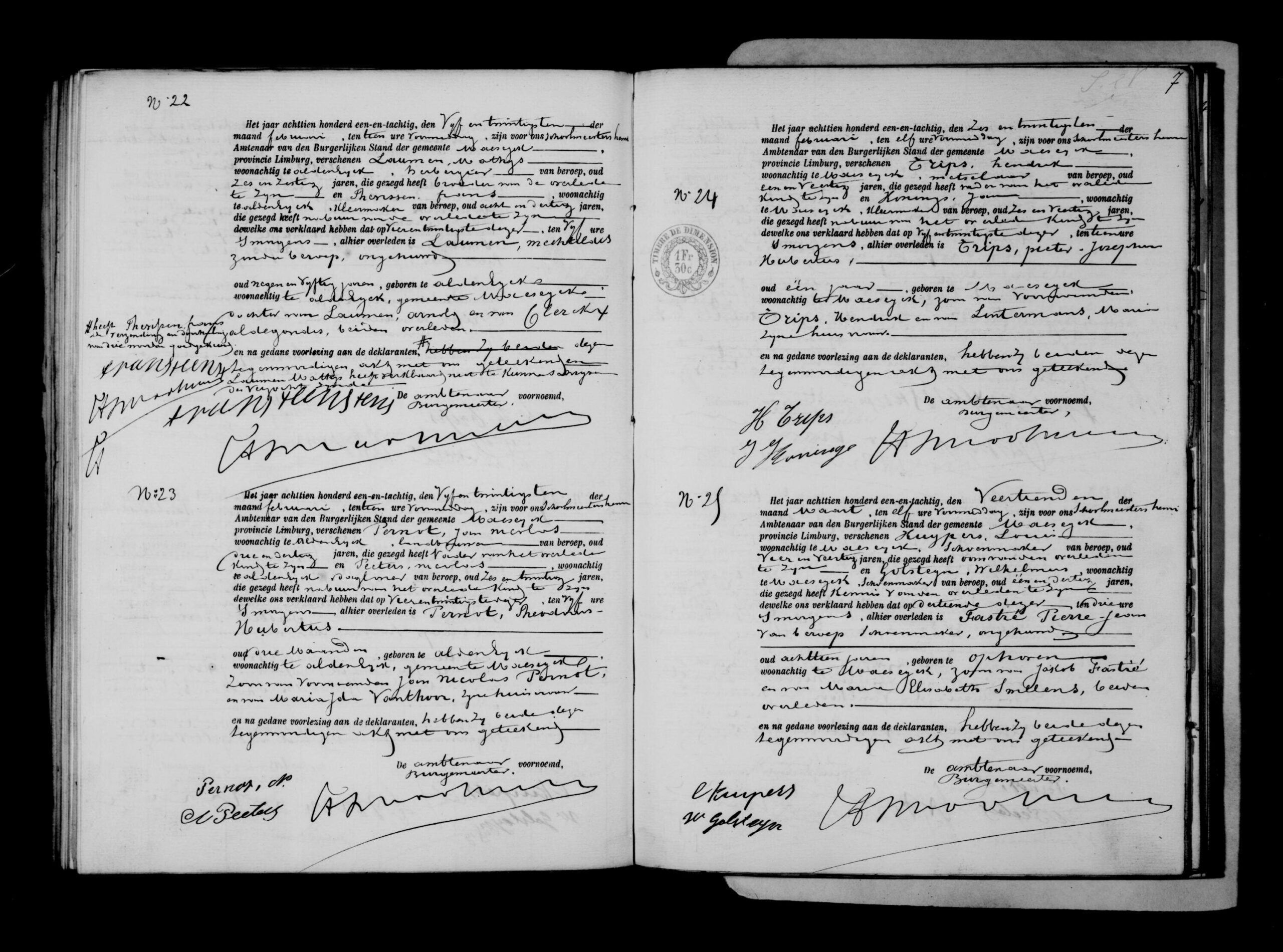 Getuigen: Jean Trips, 36 jaar oud, schoenmaker uit Maaseik, waarschijnlijk oom en Jan Konings, 45 jaar oud, kleermaker uit Maaseik, buur.