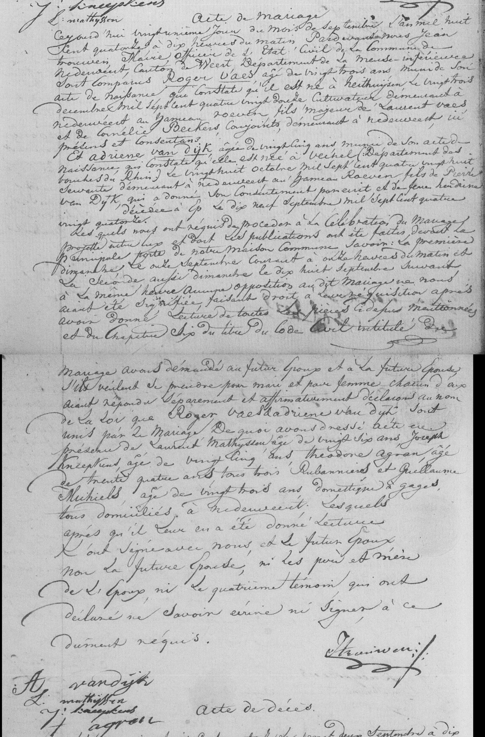 Het huwelijk vond plaats op 21 september 1814. Bruidegom Roger Vaes is landbouwer in het gehucht Roeven en is geboren te Heythuysen op 23 december 1792. Zijn leeftijd is in de akte (foutief) genoteerd als 23 jaar. Zijn ouders Laurent Vaes en Cornélie Beckers wonen eveneens in Nederweert en waren aanwezig om toestemming te geven. De bruid, Adriene van Dijk (25 jaar, dienstmeid in Roeven), is geboren te Veghel op 28 oktober 1788. Haar vader Pierre van Dijk gaf schriftelijk toestemming; haar moeder 'Hendrine' is overleden in Erp op 19 september 1794. Let op: De ambtenaar schreef in de akte dat de bruidegom wel tekende en de bruid niet ('et Le futur Epoux non La future Epouse'), maar onder de akte ontbreekt de handtekening van de bruidegom en staat wel degelijk de handtekening van de bruid ('A. vandijk'). De ouders van de bruidegom en de vierde getuige (Michiels) konden niet schrijven.