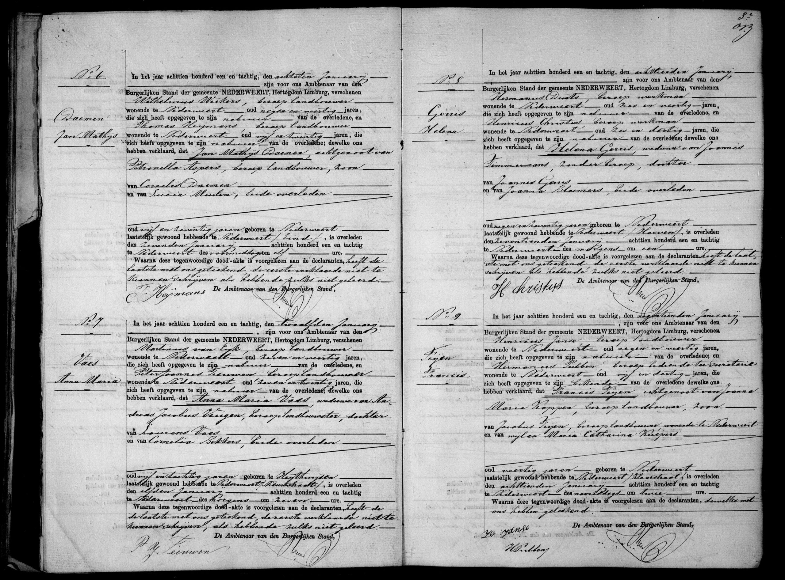 Getuigen: Jacobus van Laer, 40 jaar oud, linnenwerver uit Nederweert en Coenrardus van Riet, 58 jaar oud, linnenwever uit Nederweert en Wilhelmus Schinkels, 41 jaar oud, slachter uit Nederweert en Hubertus Simons, 31 jaar oud, schoenmaker uit Nederweert.