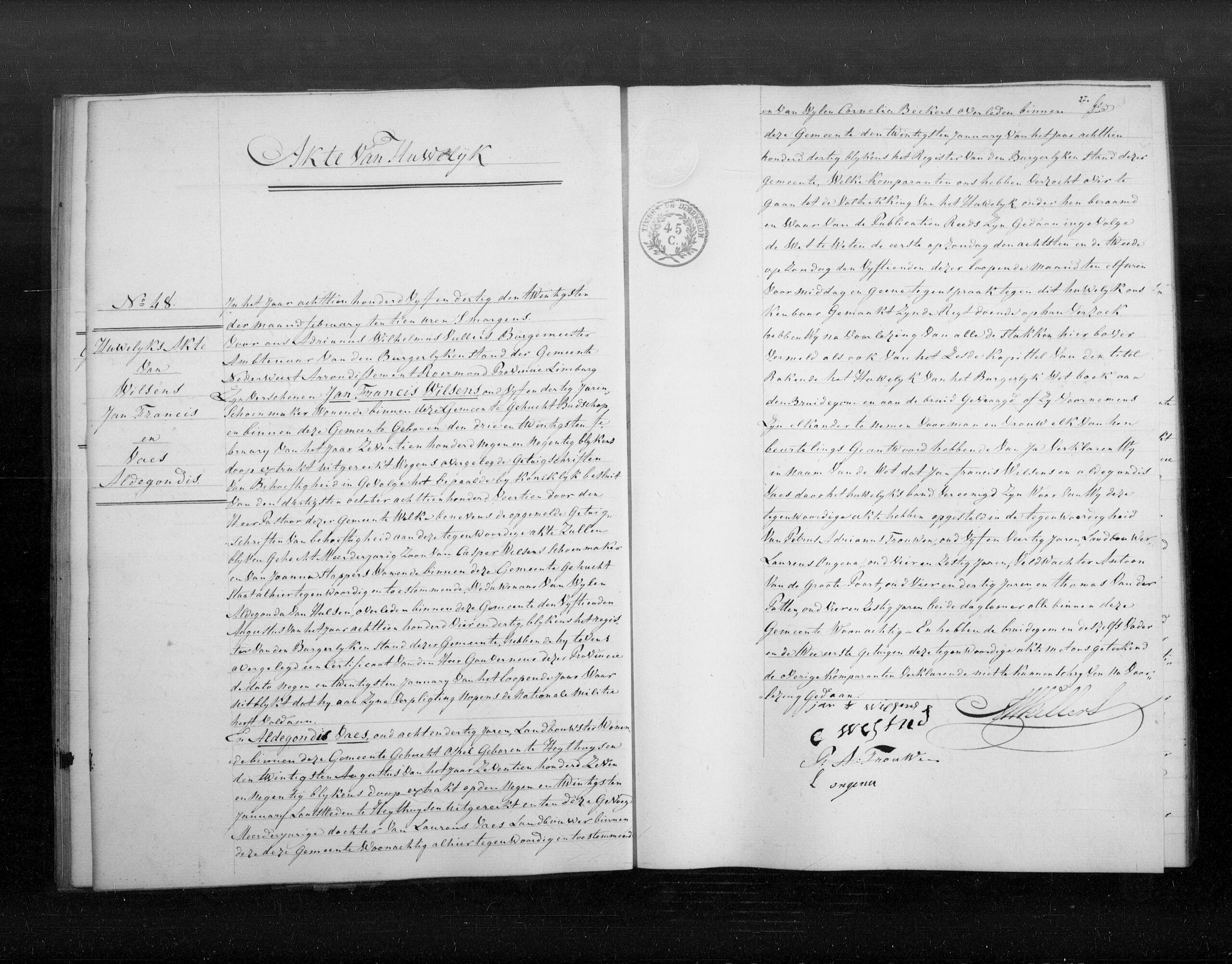 Burgerlijk huwelijk: 20 februari 1835 in Nederweert
