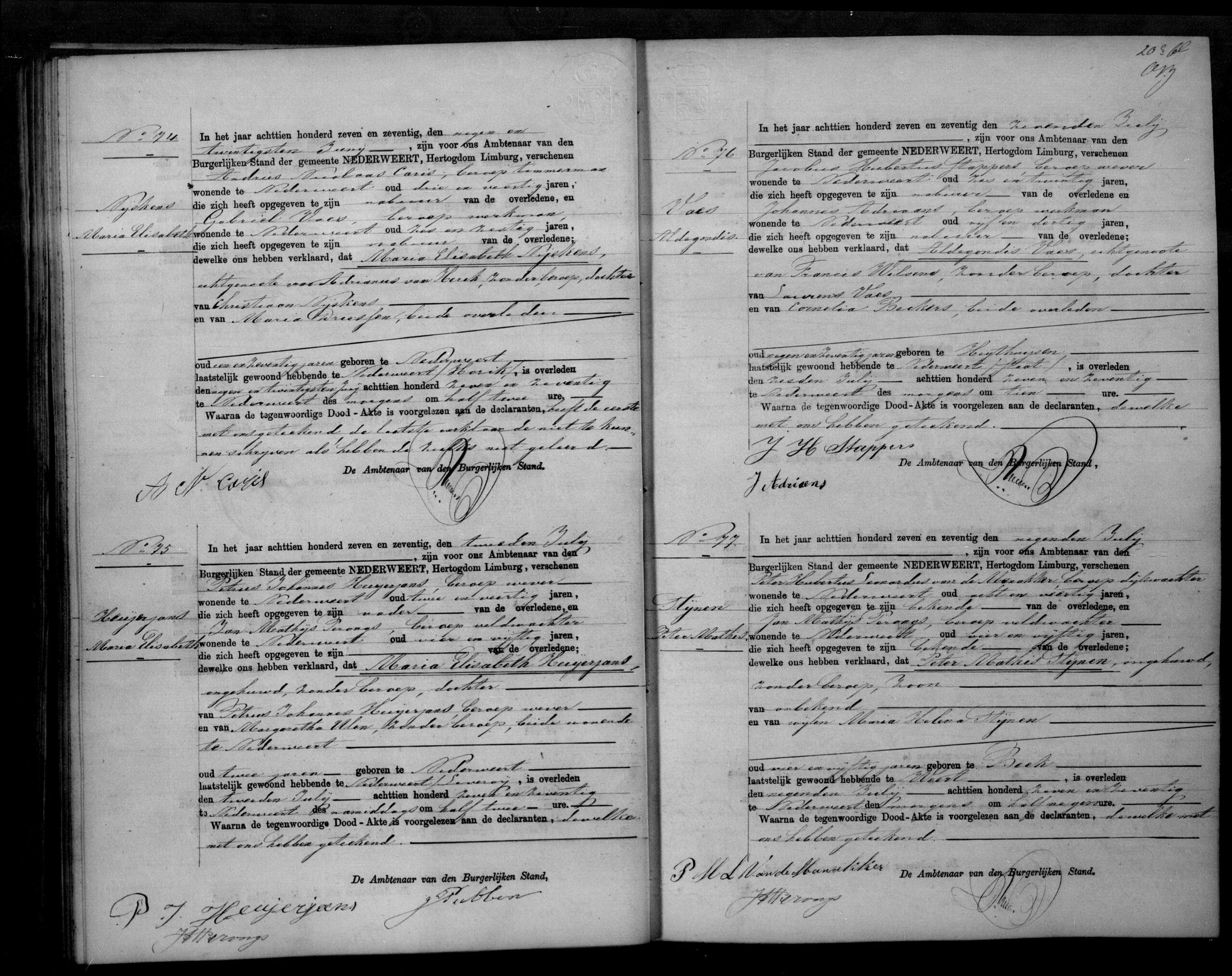 Getuigen: Petrus Adrianus Trouwen, 45 jaar oud, landbouwer uit Nederweert, kennis en Laurens Ongena, 64 jaar oud, veldwachter uit Nederweert, kennis en Antoon Van de Groote Poort, 34 jaar oud, dagloner uit Nederweert, kennis en Thomas Van der Putten, 64 jaar oud, dagloner uit Nederweert, kennis.
