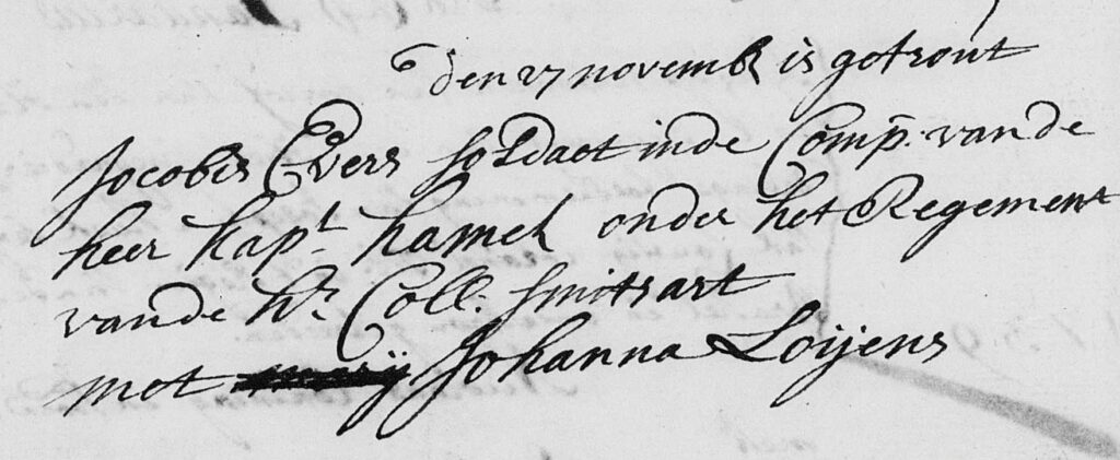 Jos: “De stamboom is nu in ieder geval opgeschoond van foutieve aannames, en dat is ook wat waard. De échte herkomst van soldaat Jacobus Evers blijft nog even een mysterie. Binnenkort komen er militaire huwelijksverloven uit 1739 beschikbaar via de scans van het Nationaal Archief in Den Haag. Ik hoop dat we daar het ontbrekende puzzelstukje in vinden. En in de tussentijd ga ik mijn pijlen richten op zijn vrouw, Joanna Loijens, om te kijken of haar achtergrond ons nog nieuwe aanknopingspunten kan bieden. Je moet gewoon stug volhouden in deze hobby.”