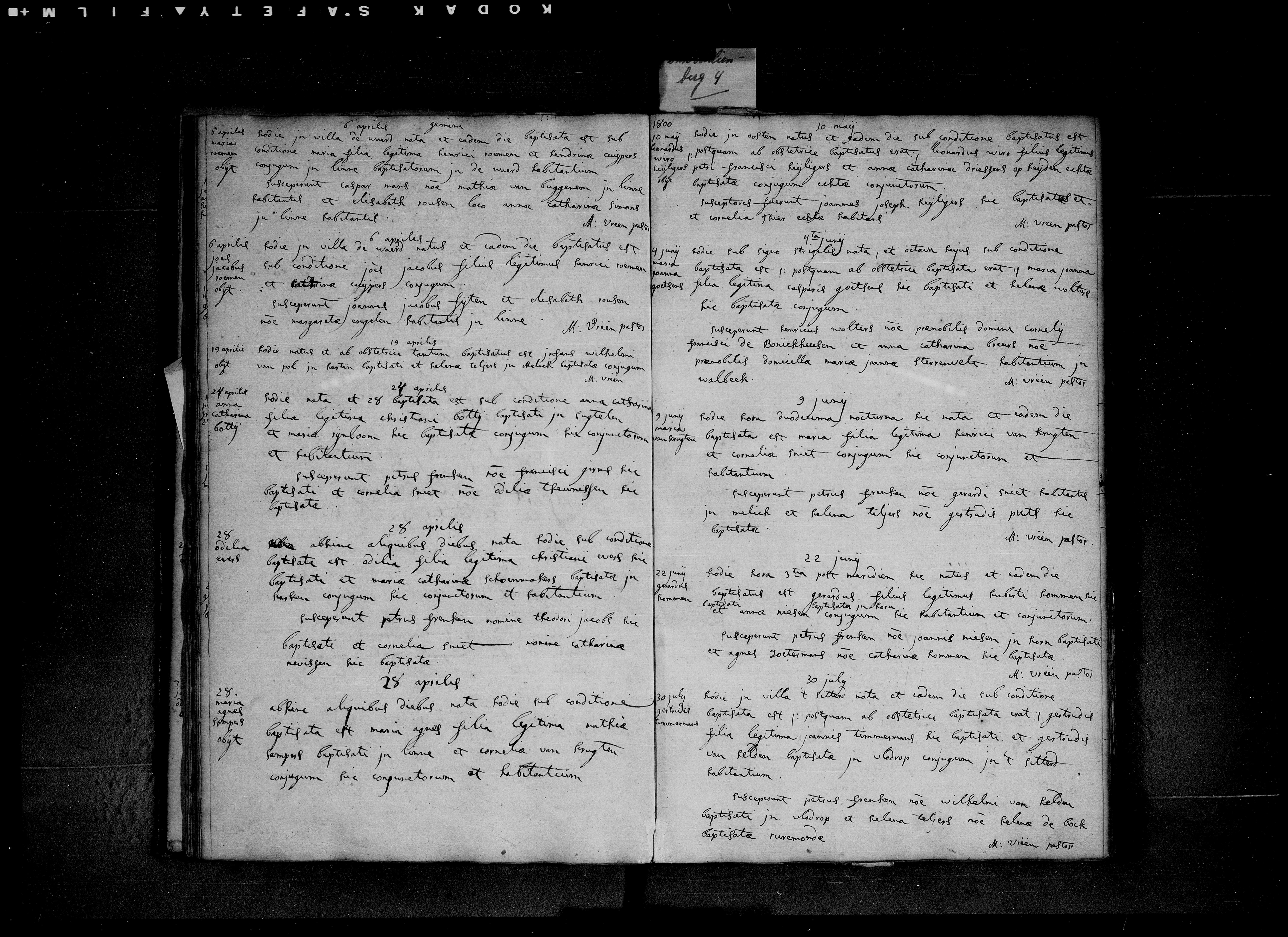 - 26 april [1800] Enkele dagen geleden geboren, is heden onder voorwaarde gedoopt: Odilia, wettige dochter van Christianus Evers, hier gedoopt, en van Maria Catharina Schoenmakers, gedoopt in Karken. Echtgenoten die hier getrouwd zijn en wonen. De doopgetuigen waren: Petrus Frenken in naam van Theodorus Jacobs (hier gedoopt) en Cornelia Smiet in naam van Catharina Mevissen (hier gedoopt).
