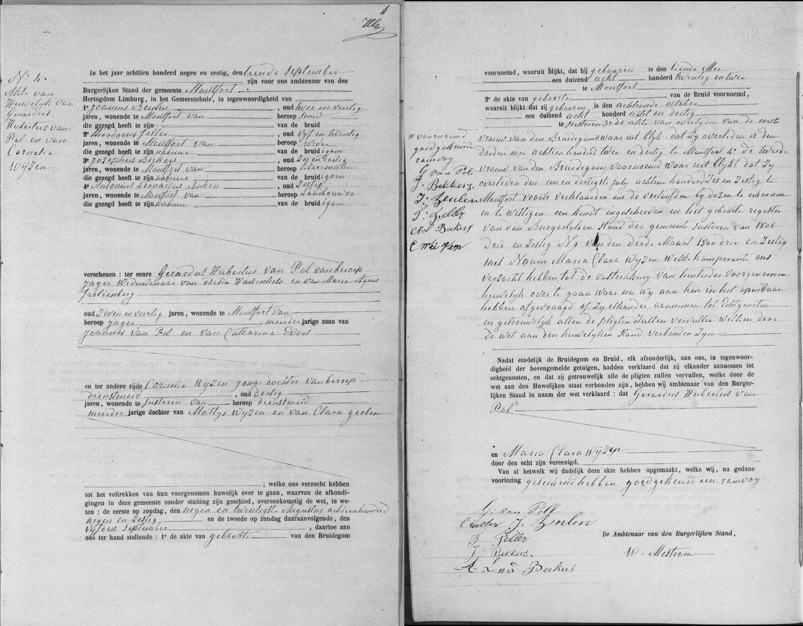 Gerardus Hubertus van Pol was op het ogenblik van dit huwelijk 47 jaar oud, jager van beroep en weduwnaar van Odilia Wassenberg (overleden op 20 juli 1848 te Montfort) en van Maria Agnes Pahlenberg (overleden op 30 juli 1866 te Montfort