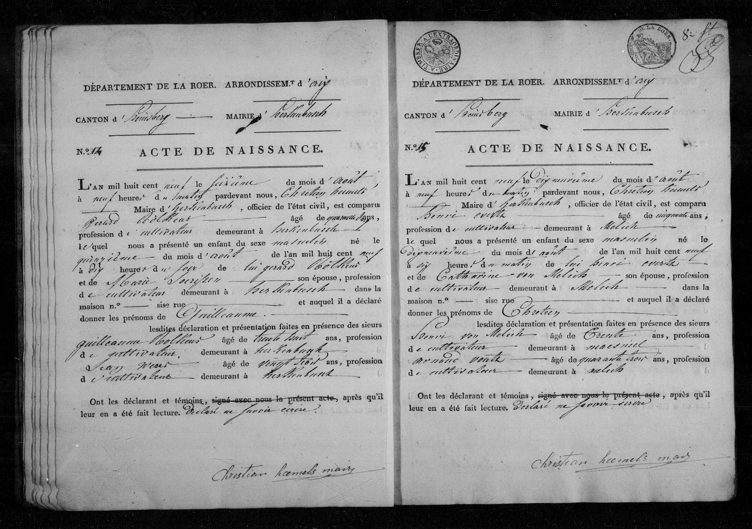Getuigen: Henri van Melick, 30 jaar oud, landbouwer uit Maasniel en Arnould Voutz, 43 jaar oud, landbouwer uit Melick.