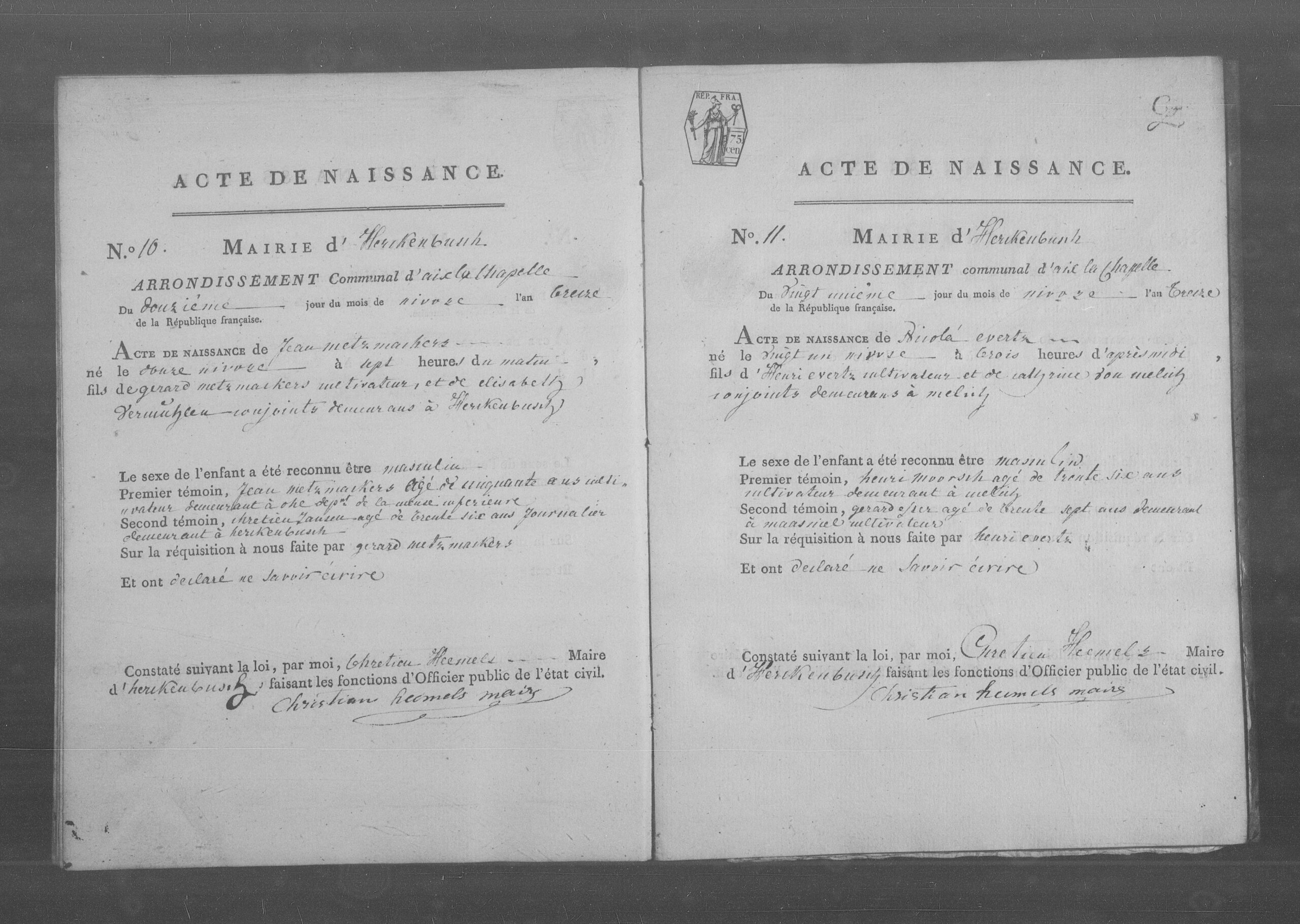 Getuigen: Gerard Essers, 37 jaar oud, uit Maasniel, mogelijk Gerardus Evers (*1766), de broer van vader Henri, en Henri Moors, schoonbroer van vader Henri.