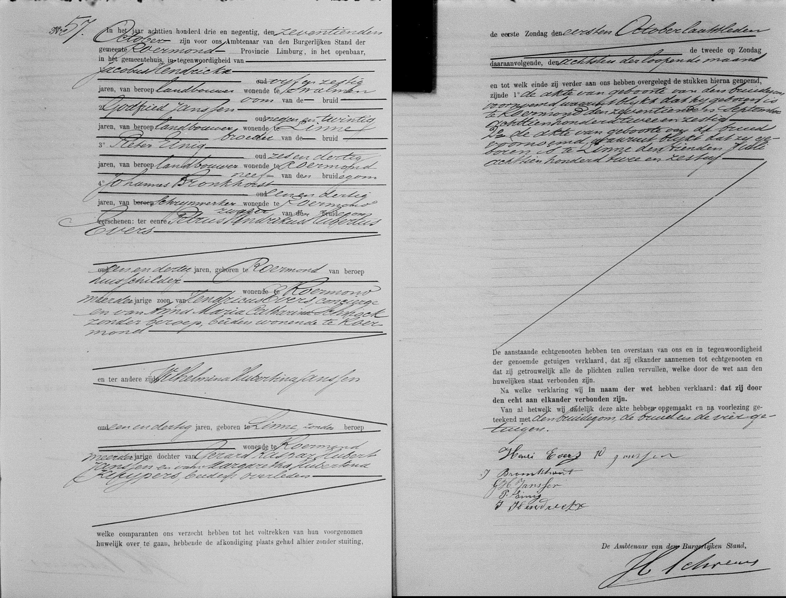 Getuigen: Jacobus Hendrickx, 65 jaar oud, landbouwer uit Swalmen, oom van de bruid en Godfried Janssen, 29 jaar oud, landbouwer uit Linne, broer van de bruid en Peter Einig, 36 jaar oud, landbouwer uit Roermond, neef van de bruidegom en Johannes Bronckhorst, 39 jaar oud, schrijnwerker uit Roermond, zwager van de bruidegom.